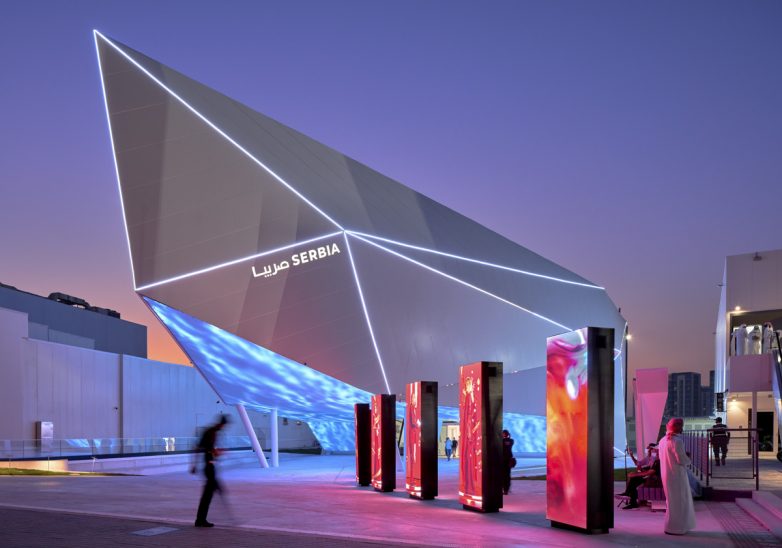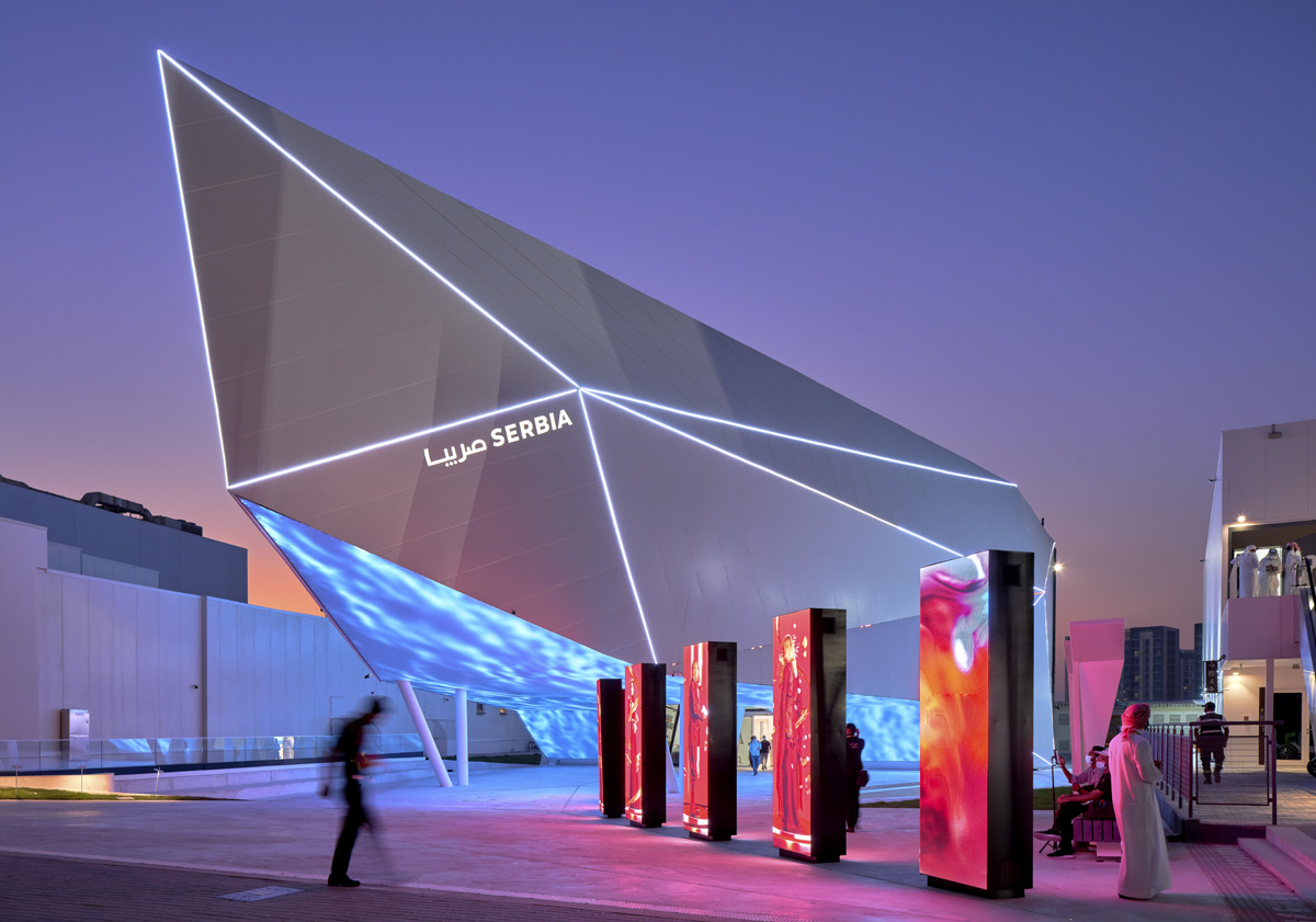 I na kraju, tu je paviljon naše zemlje. U kompleksu „Mobilnost“, po projektu beogradskog A3 Architects podignut je Paviljon Srbije sa prepoznatljivom uzdignutom trougaonom strukturom. Paviljon je osmišljen kao svojevrsna vremenska kapsula koja povezuje zaostavštinu neolitske Vinčanske kulture s digitalno modernom Srbijom.