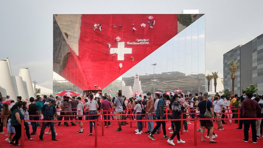 Švajcarski paviljon veoma privlači pažnju svojom fasadom koja je zapravo džinovsko ogledalo u kojem se ogleda ogromni crveni tepih. Paviljon nazvan Reflections dizajnirao je arhitektonski studio OOS sa sedištem u Cirihu, a ideja je bila da se posetioce razmisle o imidžu Švajcarske.