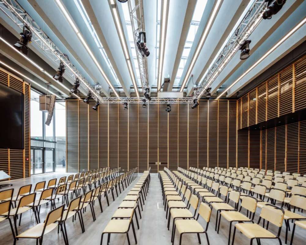 Sala za događaje osmišljena je kao retro sala za fizičko vaspitanje sa ripstolima na zidovima.