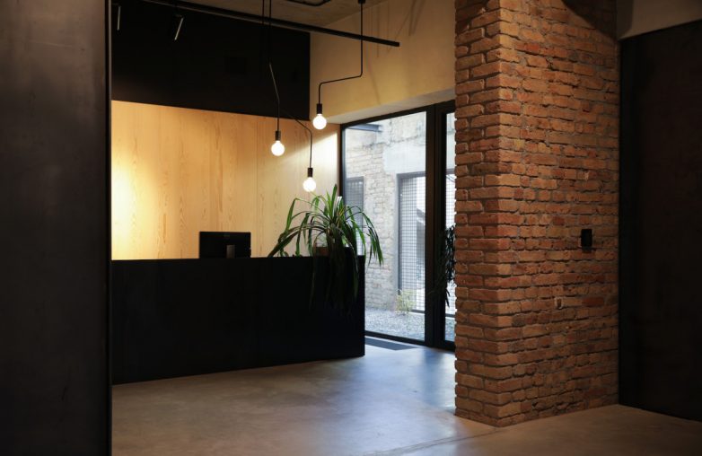 Na samom ulazu u zgradu, kojim dominira siva fasada sa crnom stolarijom, dočekala nas je dvorana duple visine sa projektnim platnom, tribinama i ogromnim staklenim prozorom visine 7 metara koji se može otvoriti po potrebi. Betonski pod u kombinaciji s originalnim zidovima od opeke kao i nameštajem s borovim furnirom osvetljenim svedenim rasvetnim telima crne boje, daju ovom prostoru potrebnu dozu elegancije i arhitektoničnosti.