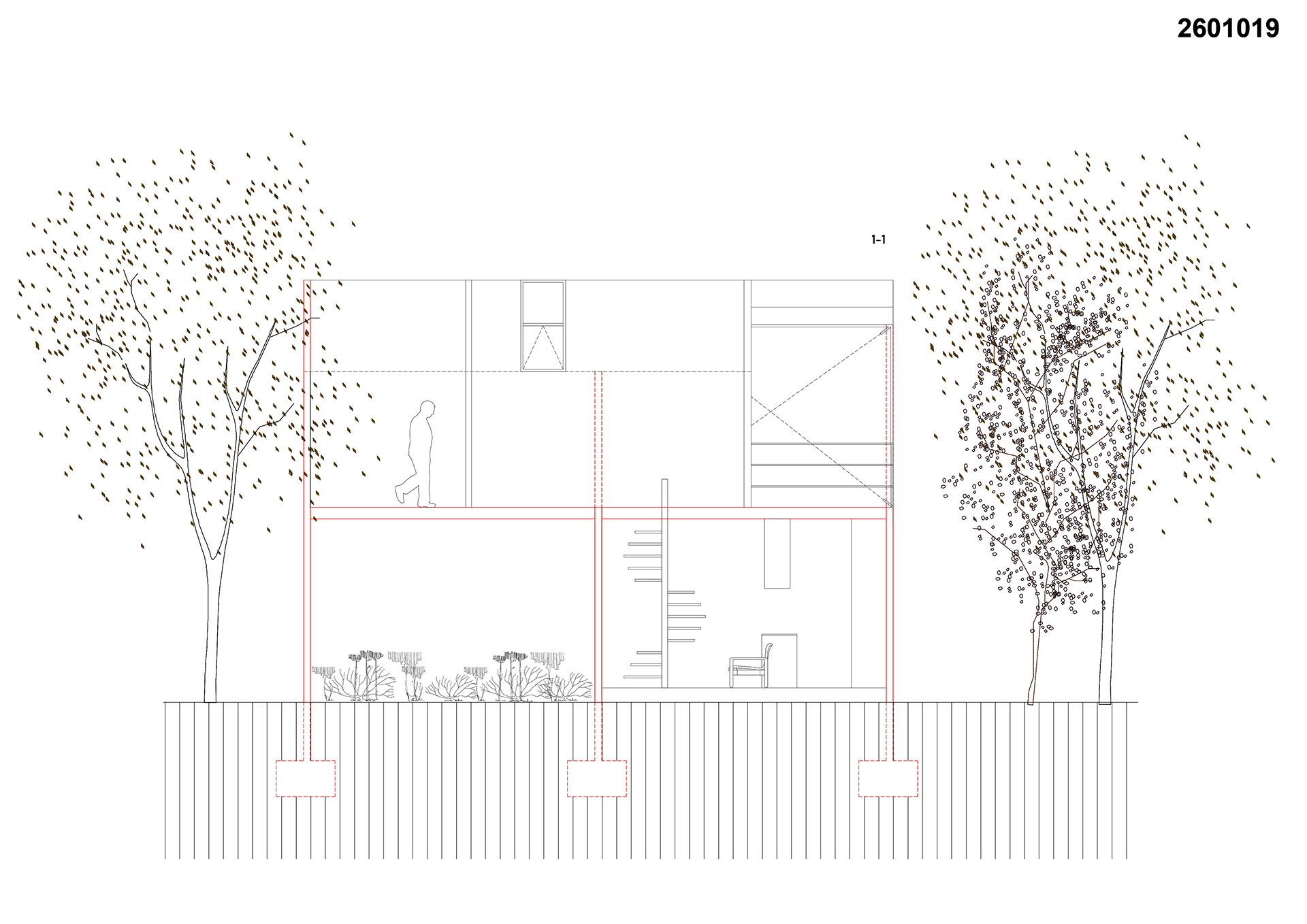 Prvi funkcionalni modul, smešten u prizemlju, projektovan je za potrebe dvočlanog domaćinstva. U okviru njega organizovani su dnevni boravak, kuhinja i trpezarija kao jedinstven, otvoren prostor koji se velikim staklenim otvorima direktno povezuje sa dvorištem.