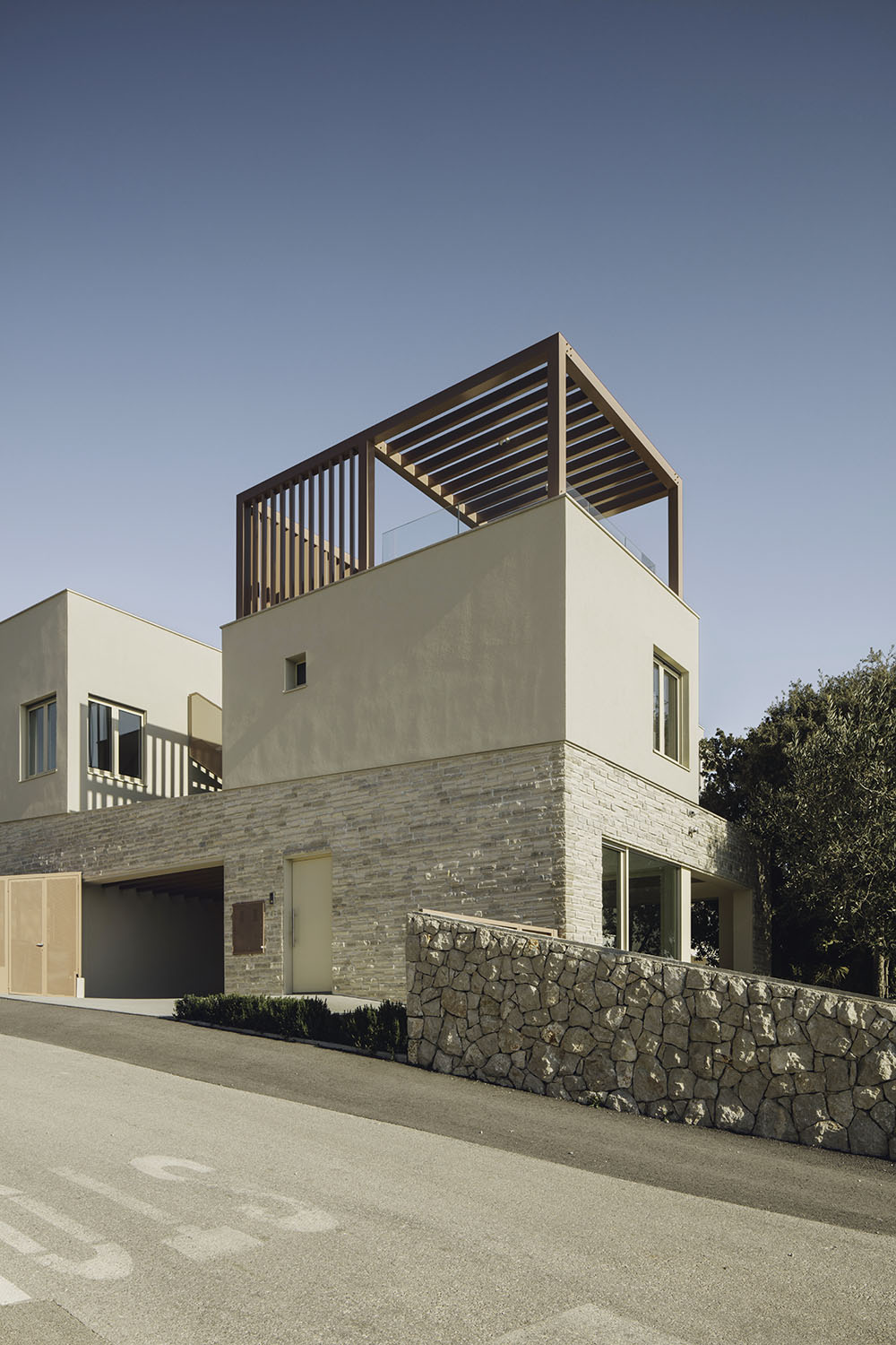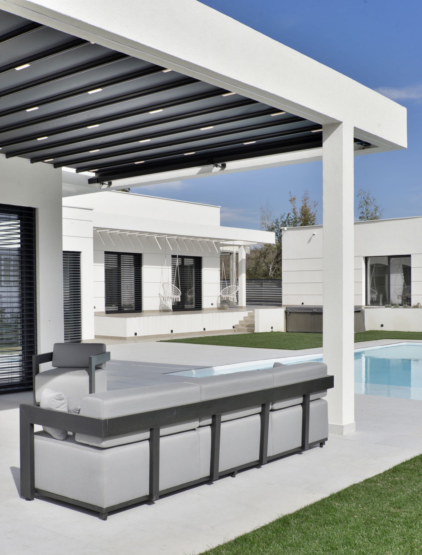 U želji da se otvoreni prostori maksimalno aktiviraju, pergolama su uokvireni prostori iznad ravnih krovova, čime se formiraju otvorene sobe.