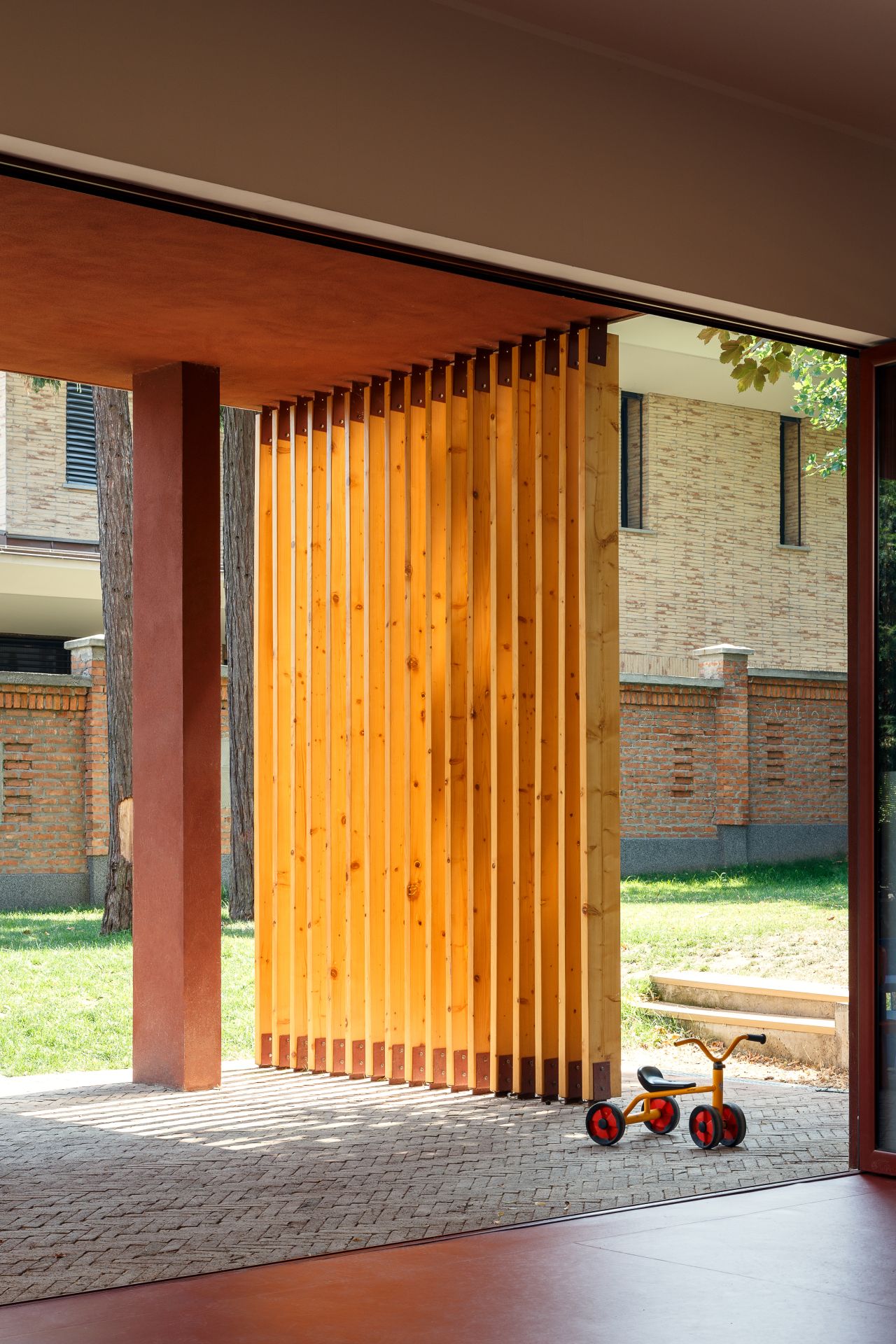 Noseći element ove pergole je čelik, dok je ispuna serija nakošenih drvenih letvi u funkciji stvaranja većeg hlada.