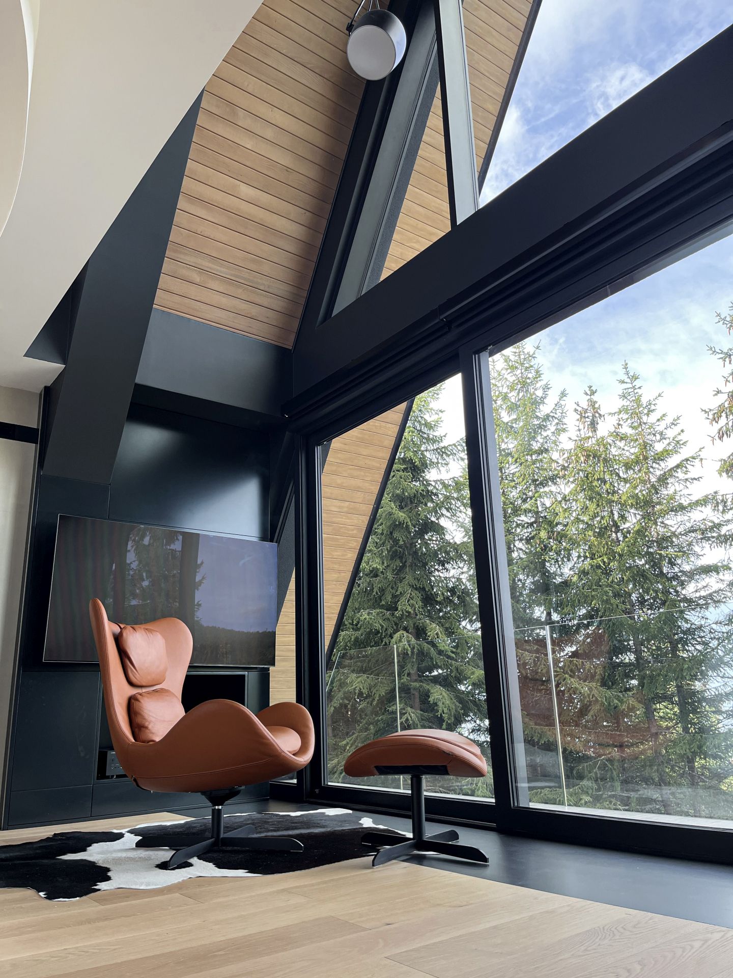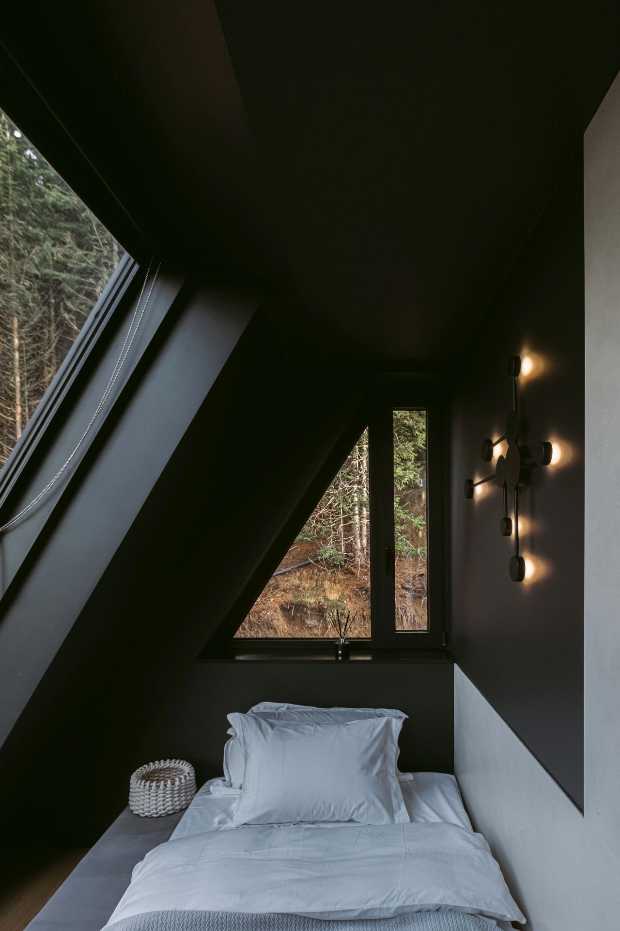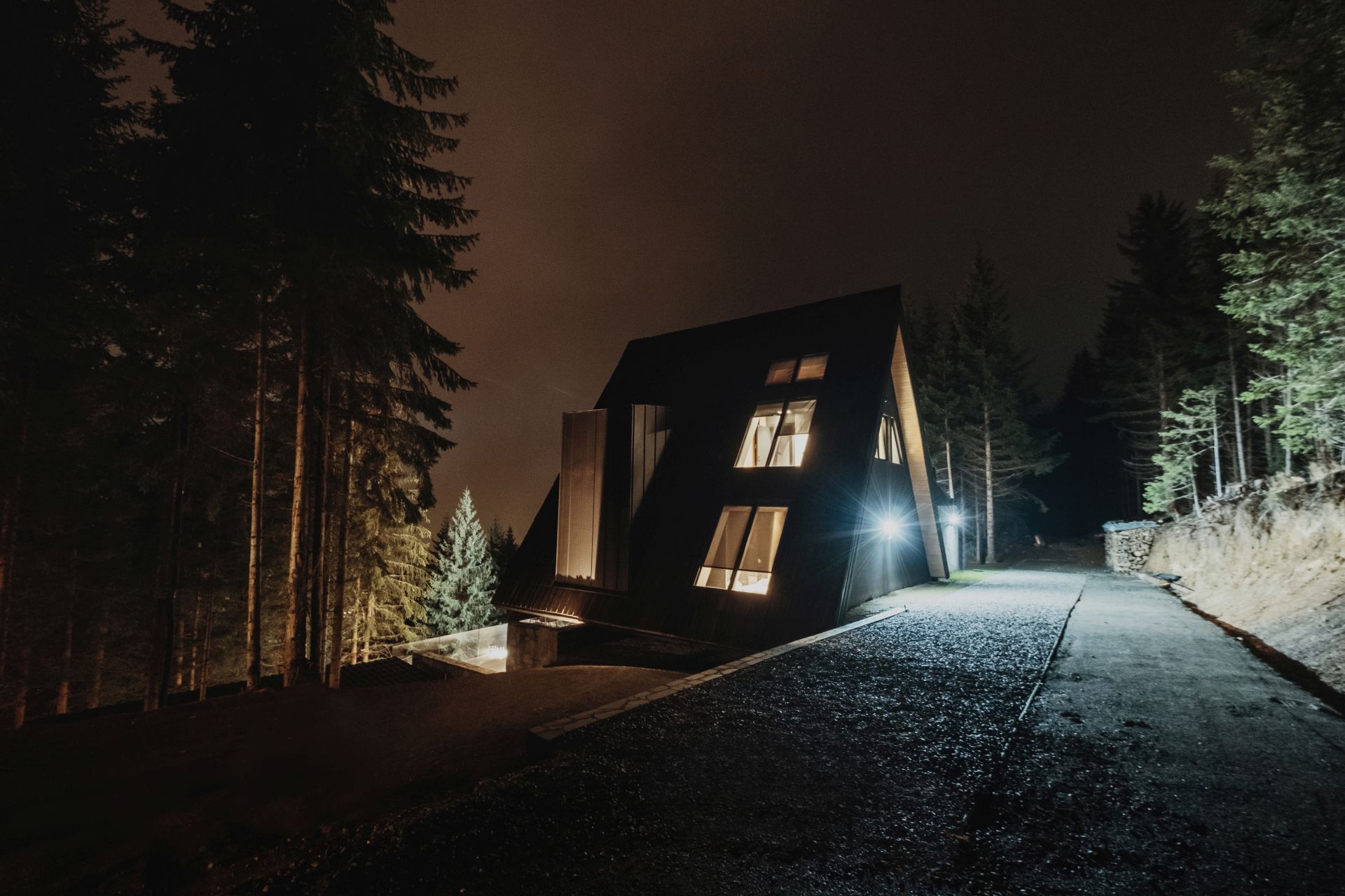 Antracit boja kuće stapa se s tamno zelenim borovima tokom letnjih meseci, dok se zimi oblik kuće koristi kao efikasan način zadržavanja snega na krovu, čime se postiže harmonija sa zimskim pejzažom.