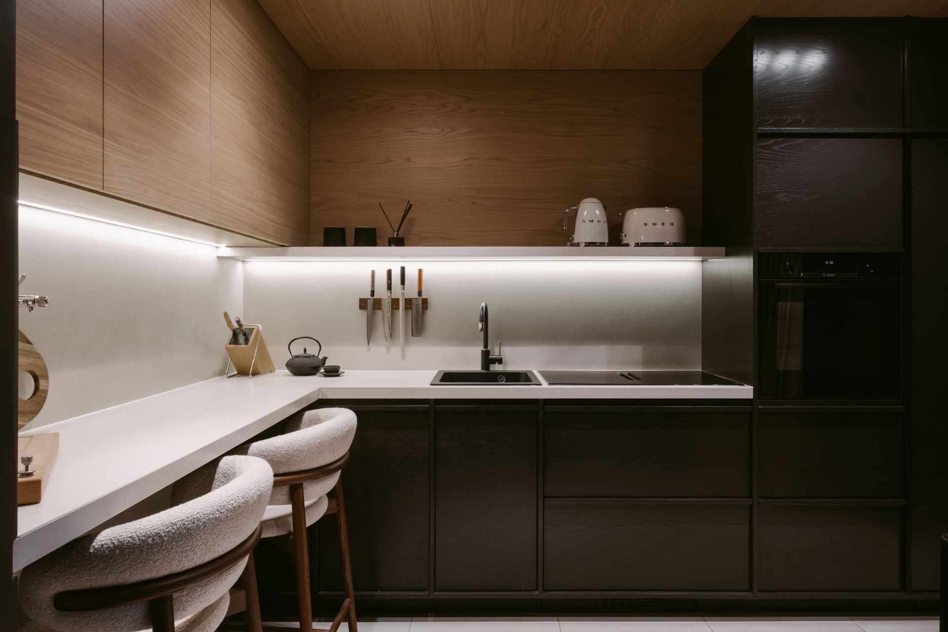 „Dizajn enterijera prati stil moderne planinske kuće, koristeći dekor dezena od drveta, keramike u svetlim peščanim tonovima, i naglašavajući antracit, gotovo crni ton koji hrabro oblikuje prostor i povezuje ga sa eksterijerom“ – kaže osnivačica studija.