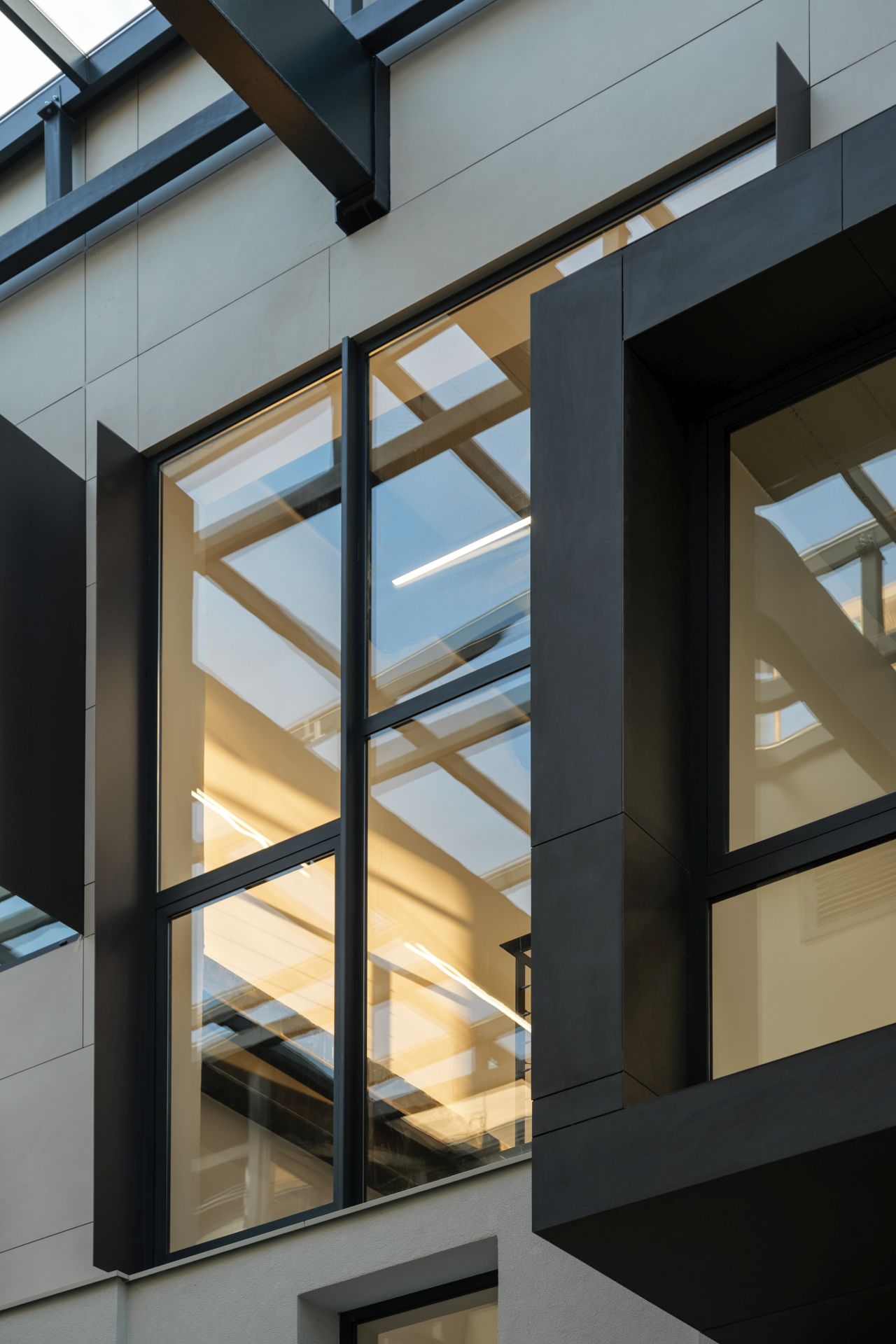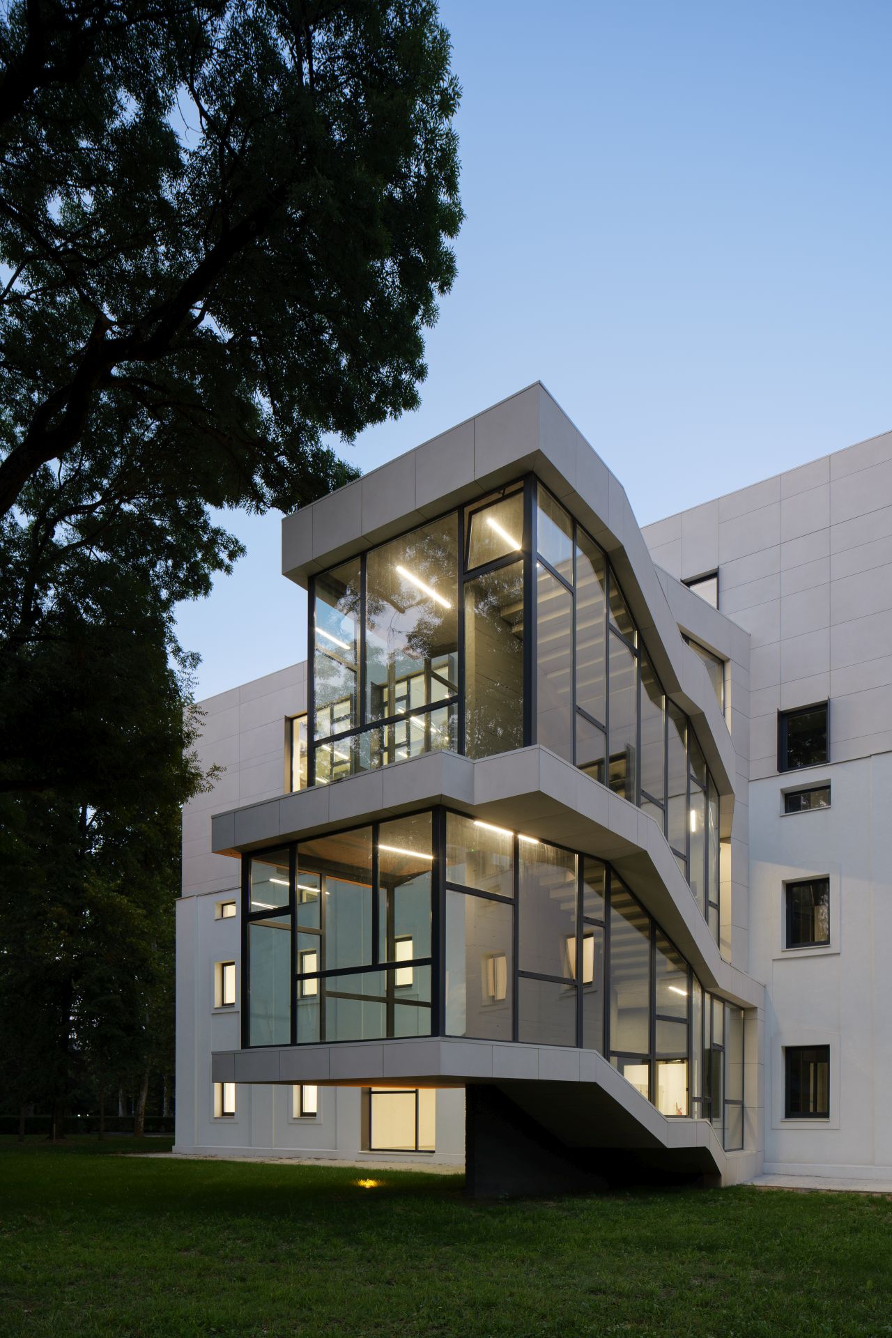 Jednostavna, na tek nekoliko oblikovnih elemenata redukovana nova zgrada, igra ulogu kontrapunkta u odnosu na postojeći, stari objekat.