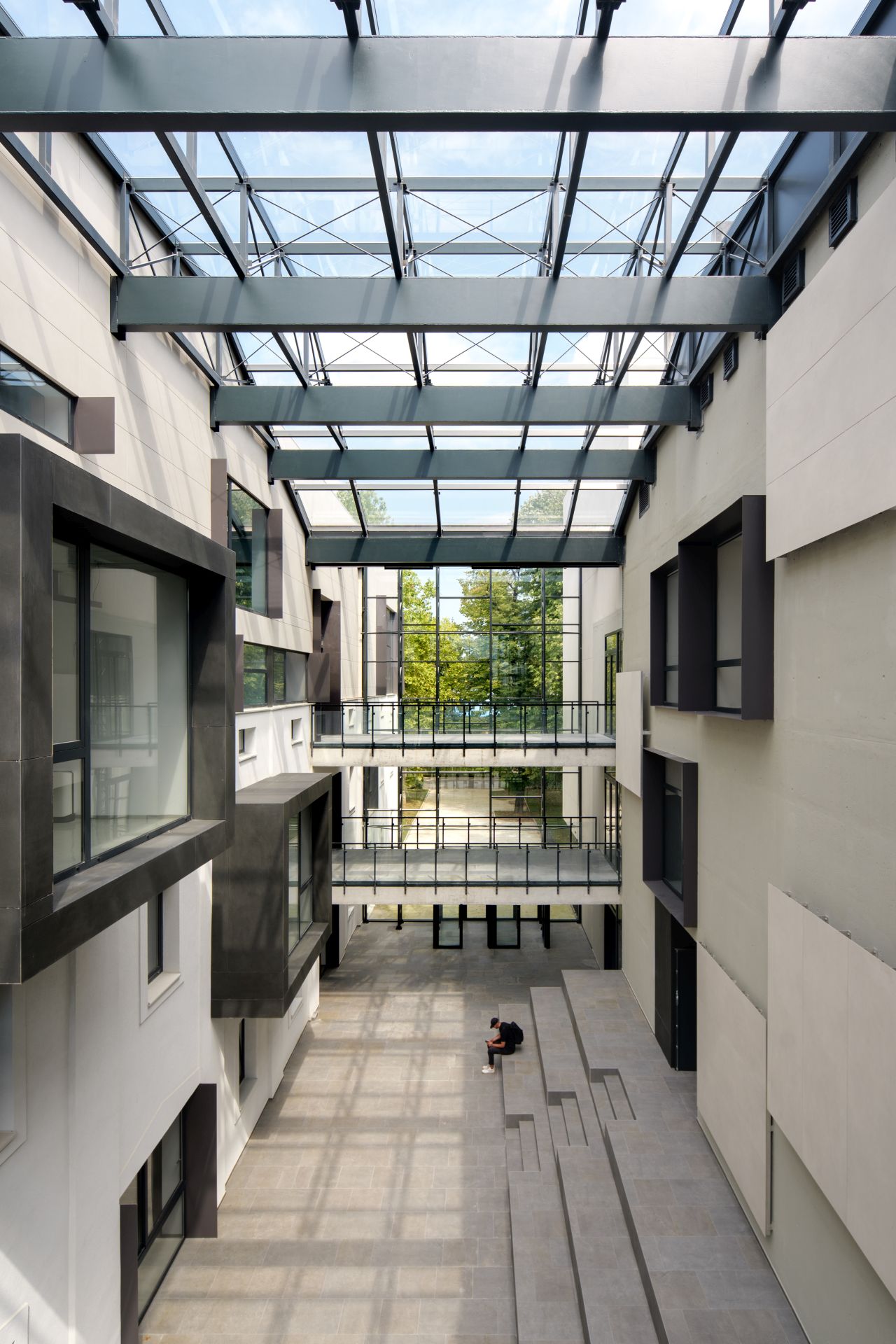 Prostorni koncept povezivanja i „pomirenja“ razlika između starog i novog dela baziran je na sintezi ova dva kubusa ostakljenim centralnim holom, koji se proteže kroz sve etaže po visini.