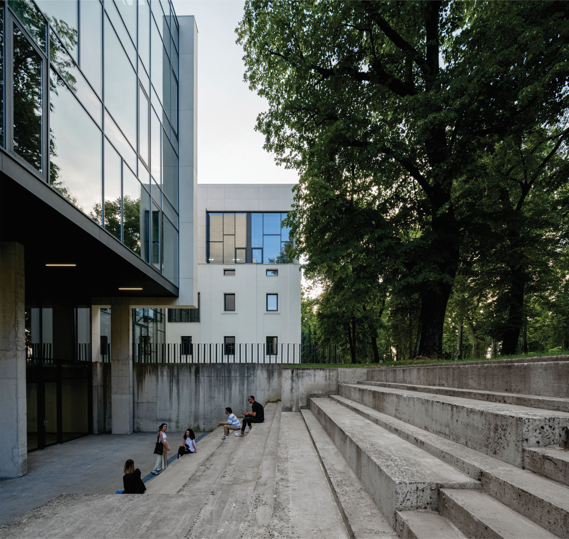 „Jednostavna, na tek nekoliko oblikovnih elemenata redukovana nova zgrada, igra ulogu kontrapunkta u odnosu na postojeći, stari objekat. Zbog svojih gabarita, strukture i konstruktivnog sistema, postojeći objekat ‘Tereza’ sa nadogradnjom projektovan je kao administrativna celina Fakulteta“, navode arhitekte.