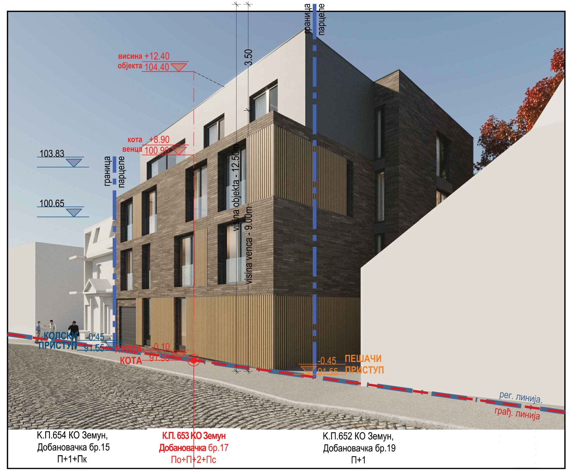 Na adresi Dobanovačka 17 u Zemunu planirana je izgradnja stambeno-poslovnog objekta spratnosti Po+P+2+PS, čiji su investitori dva fizička lica, dok je projektant preduzeće Alextra d.o.o. iz Beograda.
