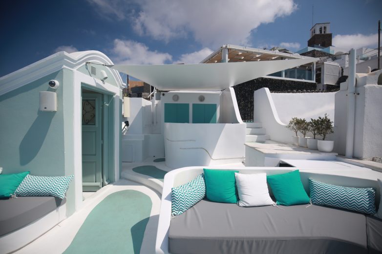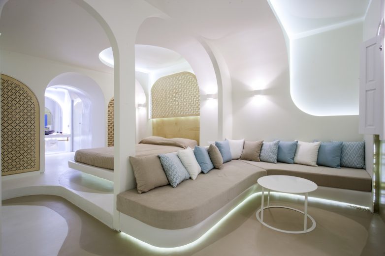 Šest velikih apartmana i “nebeski bar” na terasi zamišljeni su kao moderna interpretacija pećine poput uobičajenih objekata na Santoriniju.
