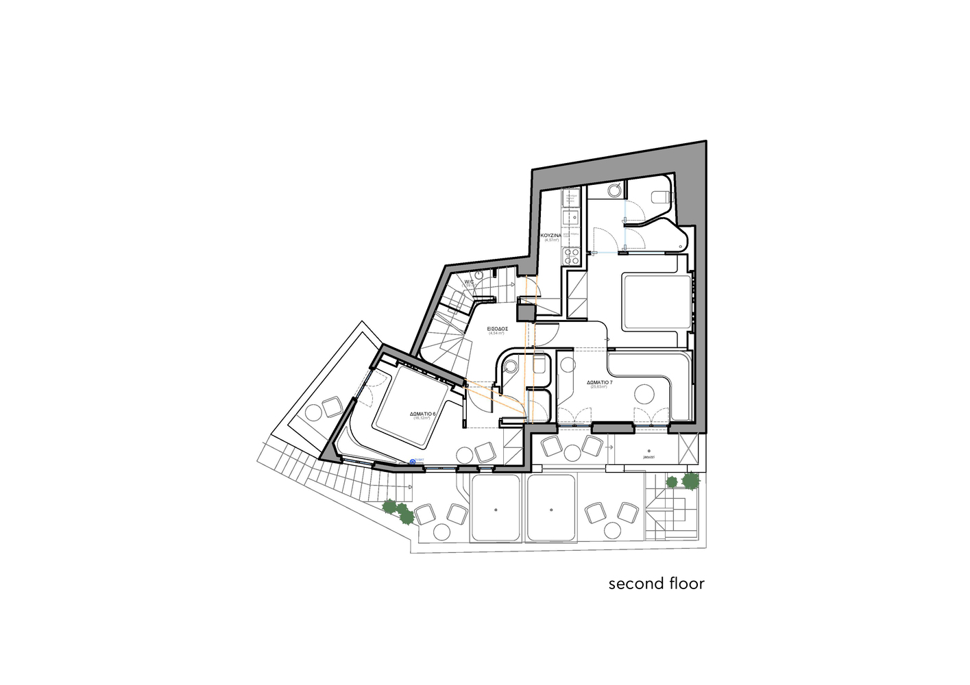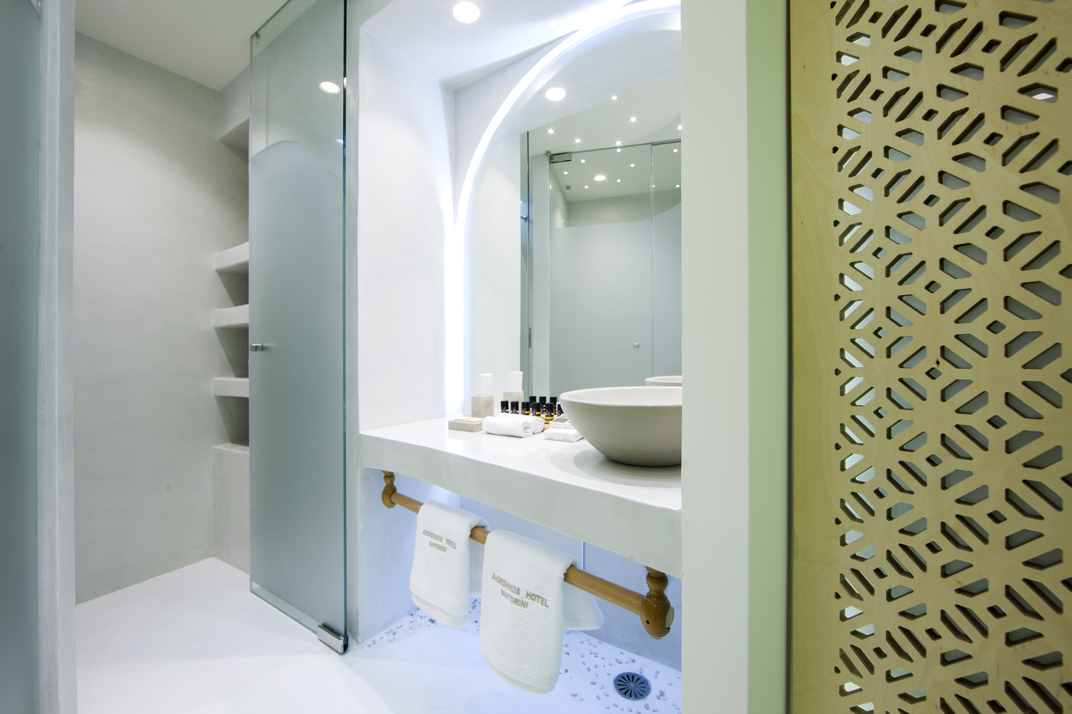 Smeštena iz iznad vulkanske kaldere i čuvene stene „Skaros“, postojeća zgrada se arhitektonskim rešenjem KLAB-a prilagodila potrebama novog hotela.