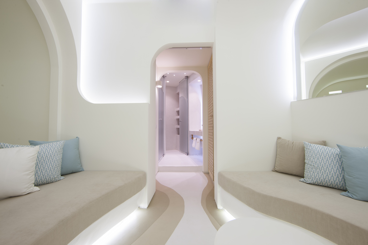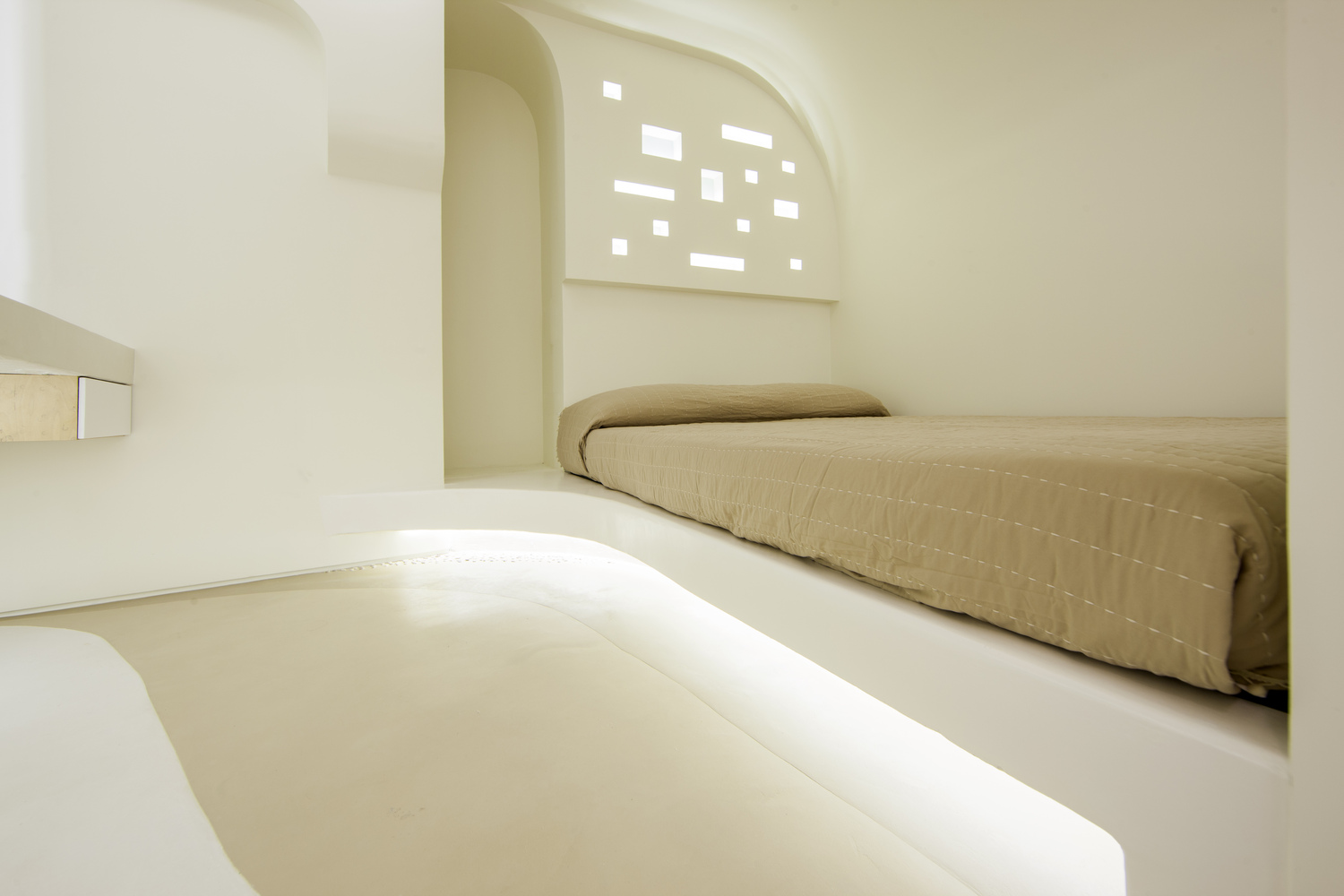Šest velikih apartmana i “nebeski bar” na terasi zamišljeni su kao moderna interpretacija pećine poput uobičajenih objekata na Santoriniju.