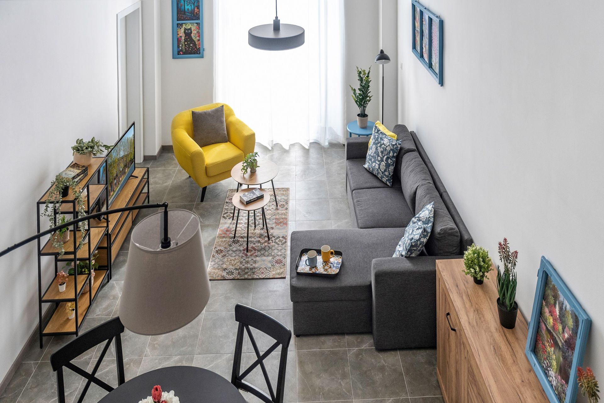 Prozorska okna stare fabrike, nakon obrade drveta, našla su svoje mesto na zidovima apartmana kao ramovi za slike.