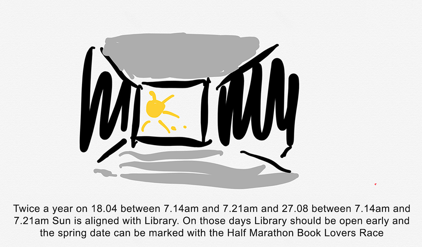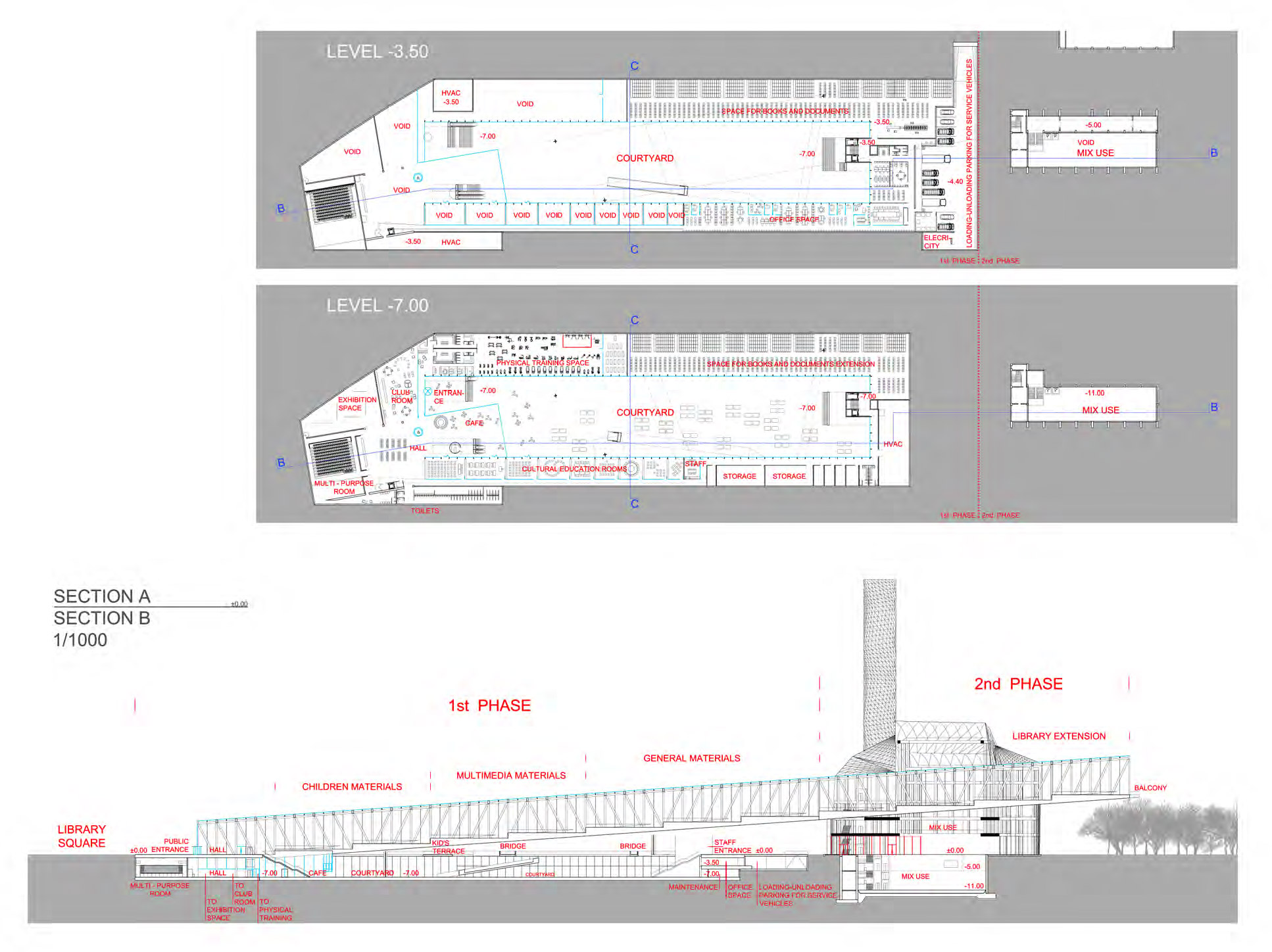 Podzemni prostor ispod pešačkog „kičmenog stuba“, većim delom ukopan u zemlju, predviđen je za depo Glavne Gradske biblioteke, ali i drugih gradskih ogranaka. Tu su i kancelarije, sale za sastanke, edukaciju i obuke, ali i za rekreativne aktivnosti.
