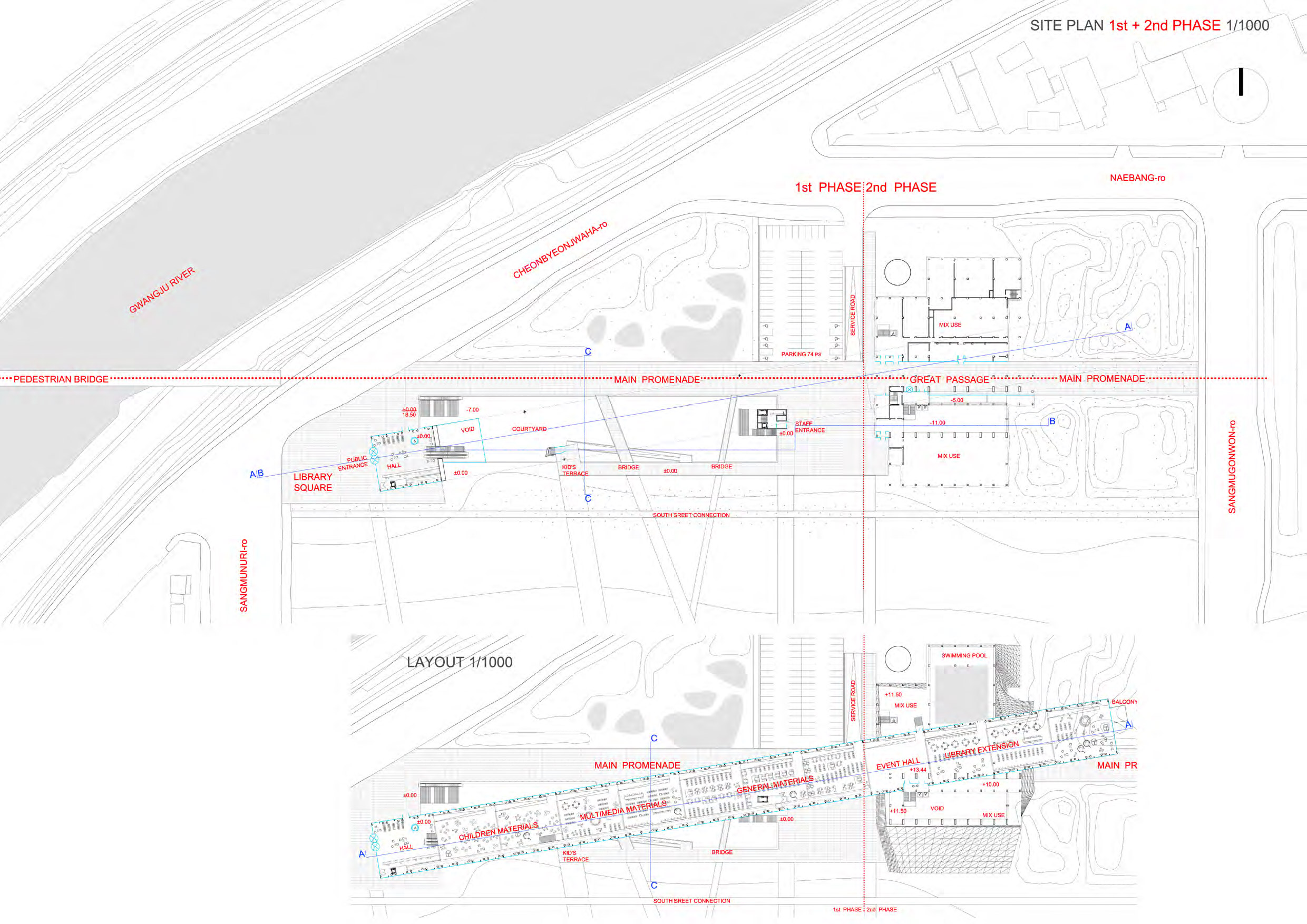 Svojevrsni pešački „kičmeni stub“ u okviru prve faze projekta, sastoji se iz osam, kaskadno pozicioniranih platoa, površine 492 kvadrata, pri čemu denivelacija između kaskada iznosi 168 centimetara. Ovi platoi koristiće se kao prostor za čitaonicu biblioteke, predavanja i drugog multifunkcionalnog javnog sadržaja. Platoi su povezani jednom kontinualnom rampom blagog nagiba, što olakšava komunikaciju korisnika, naročito onih sa posebnim potrebama, ali i distribuciju knjiga putem kolica.
