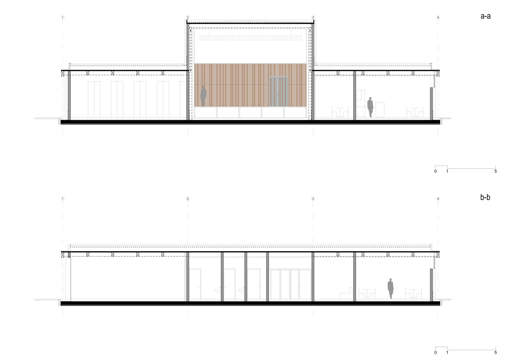 Jezgro zgrade čini izdignuta, natkrivena pozornica — platforma za nastupe i druženje, okružena servisnim prostorijama.
