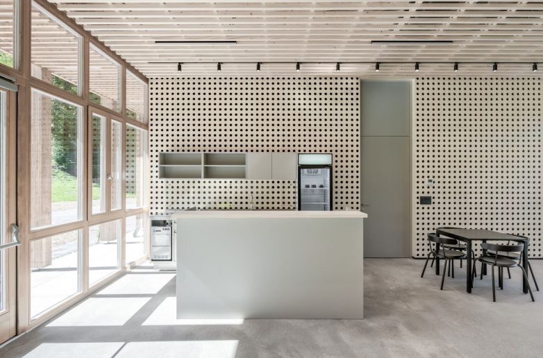 Drveni višenamenski paviljon u Sloveniji odlikuju veliki rasponi i obodna nadstrešnica visine 8 metara koja povezuje sve programske celine.