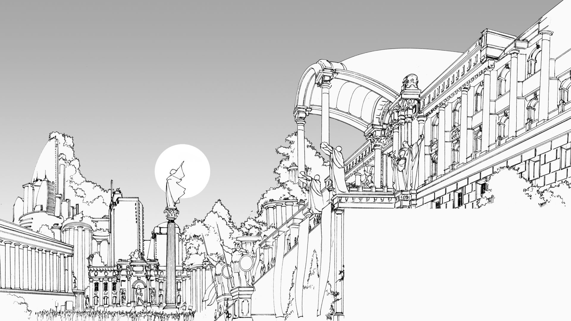 Antički hramovi, slavoluci, kolonade stubova i drugi motivi antičke arhitekture, vešto su kombinovani sa motivima svemirske i epske fantastike.