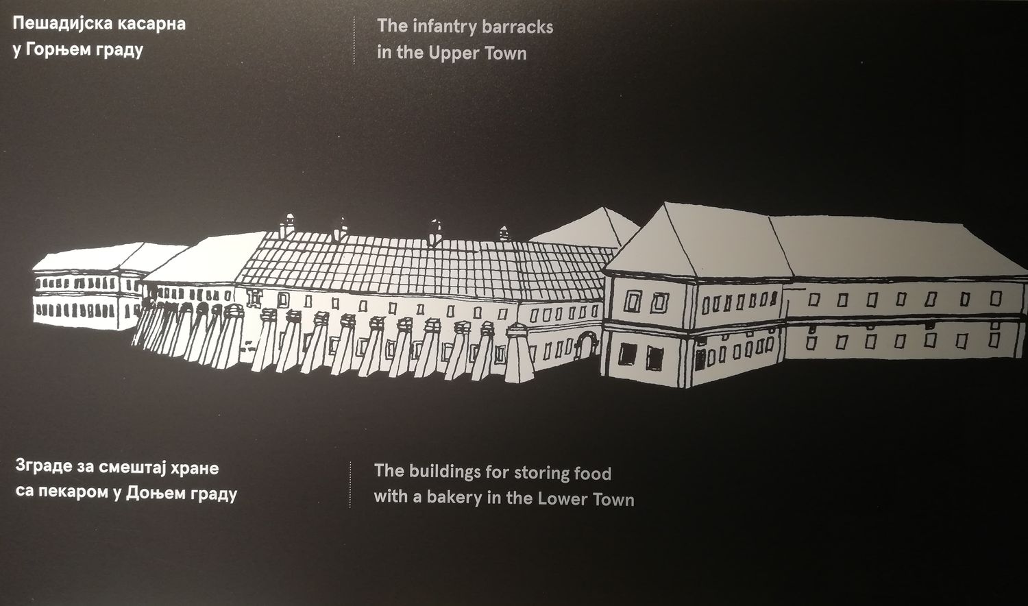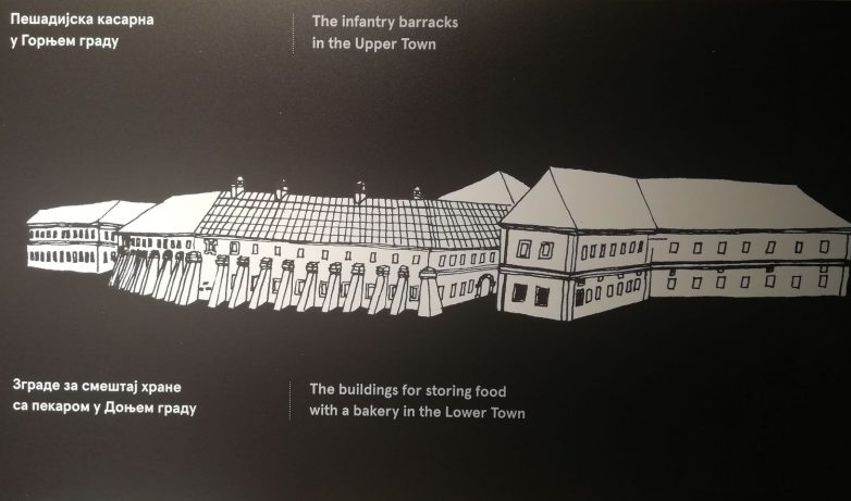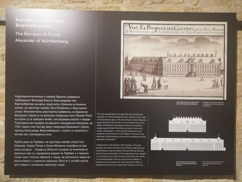 Za početak tu je kompletna transformacija Beogradske tvrđave, koja je izvedena po idejama i projektima pukovnika Nikole Doksata de Moreza. Izvedena je po uzoru na nešto ranije izgrađenu Petrovaradinsku tvrđavu, a njen sistem rovova, bastiona, zidina i vojnih objekata, pre svega kasarni, bila je u tom trenutku na najsavremenijem nivou u Evropi. Najznačajnija bila je kasarna Aleksandra Virtemberškog, izgrađena na prostoru između današnjeg Trga Republike i Zmaj Jovine ulice. O njenoj monumentalnosti govori više gravira i crteža iz tog perioda, a ponovnim padom Beograda u Osmanske ruke, biva potpuno srušena jer Turci nisu mogli da za svoje potrebe i navike upotrebljavaju tako visoke objekte (dva sprata i potkrovlje). Od materijala nastalog njenim rušenjem zidane su kuće i džamije. Na izložbi su prikazani izgledi austrijskih vojnika, njihove uniforme i oružje, a specijalno za ovu priliku, izložen je i jedan austrijski top koji pripada Vojnom muzeju.