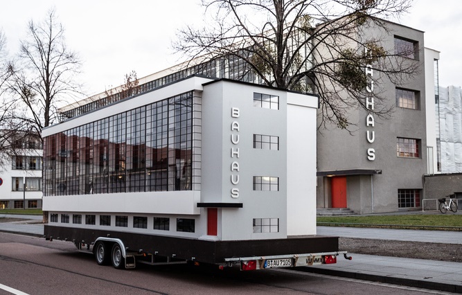 Autobus je dizajniran po uzoru na originalnu Bauhaus zgradu u Desau u kojoj je Walter Gropius osnovao čuvenu školu 1919. godine.