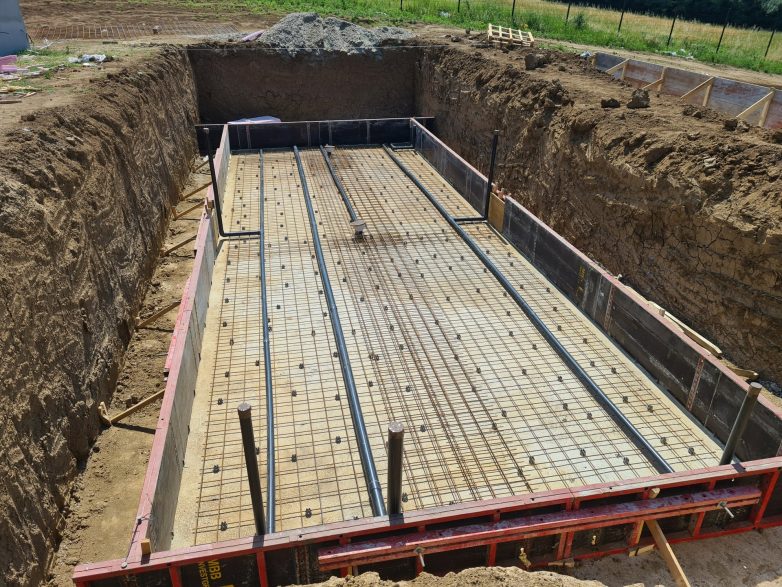 Nakon što je bazen iskopan, vreme je za postavljanje armature i šalovanje podne ploče i zidova. Takođe je potrebno pored bazena izgraditi tehničku prostoriju za smeštanje bazenske opreme – ili, na primer, iskoristiti postojeći podrum u blizini.