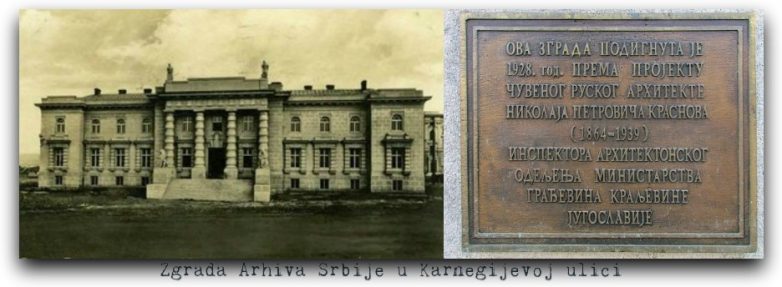 Gotovo da nema ni jednog značajnijeg državnog ili dvorskog objekta, kako arhitekture tako i enterijera, na kojem svoj autorski pečat nije ostavio arhitekta Krasnov. Po nekima i previše favorizovan od strane kralja Aleksandra Karađorđevića, ovaj carski dvorski arhitekta je kvalitetom svojih ostvarenja zaista opravdao svoju angažovanost u nastanku na stotine državnih i privatnih objekata u Beogradu i širom Kraljevine SHS/Jugoslavije. Ispred jednog od njih, zgrade Arhiva Srbije u ulici Karnegijevoj 2, unutar parka Mali Tašmajdan, otkriven je spomenik Nikolaju Krasnovu.