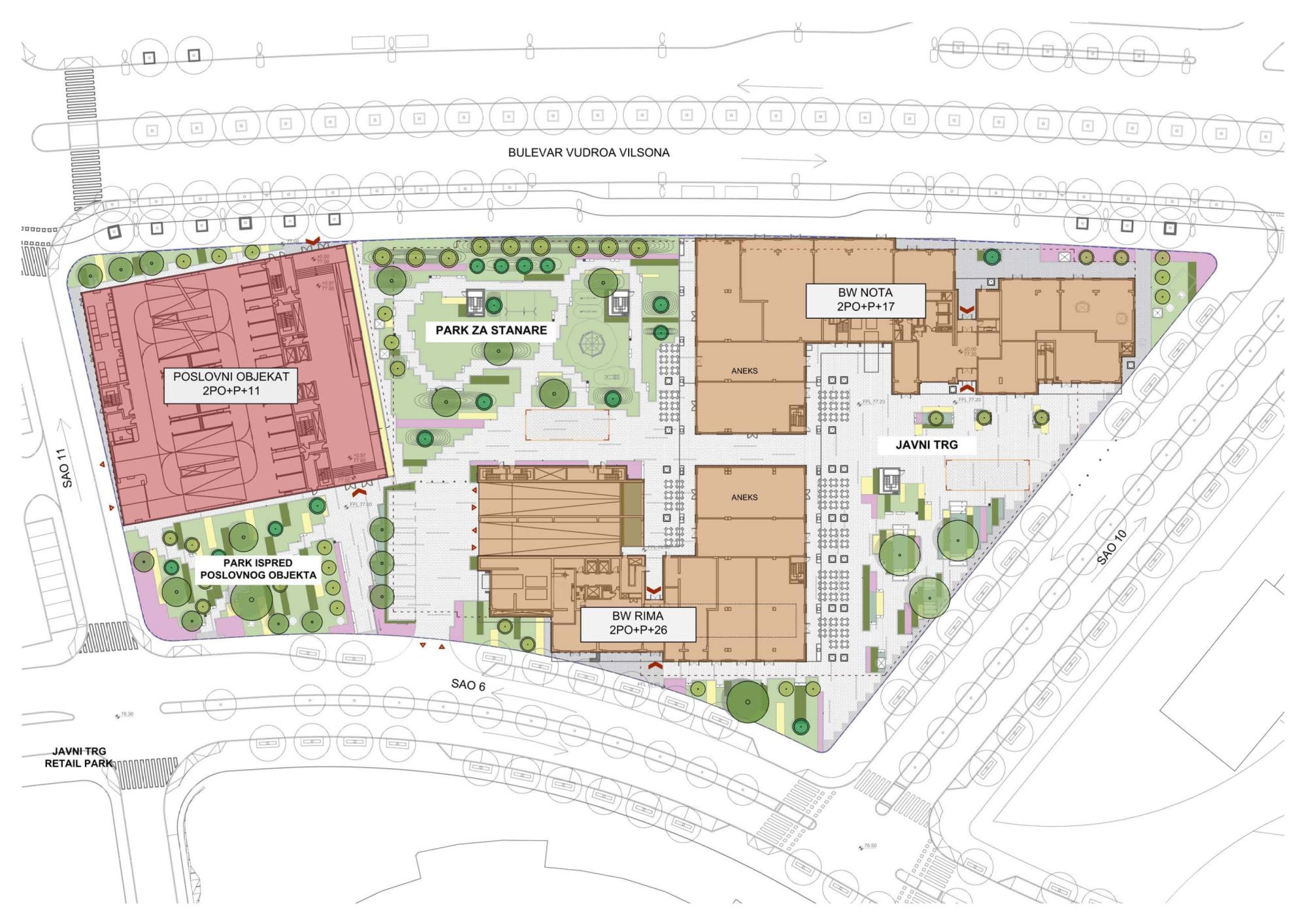„Na kraju, tu je i javni trg, proširenje javnog prostora BW-a na trasi od buduće metro-stanice ka reci i Kuli Beograd, koji predstavlja mesto zadržavanja i okupljanja pod krošnjama drveća na urbanim tribinama.