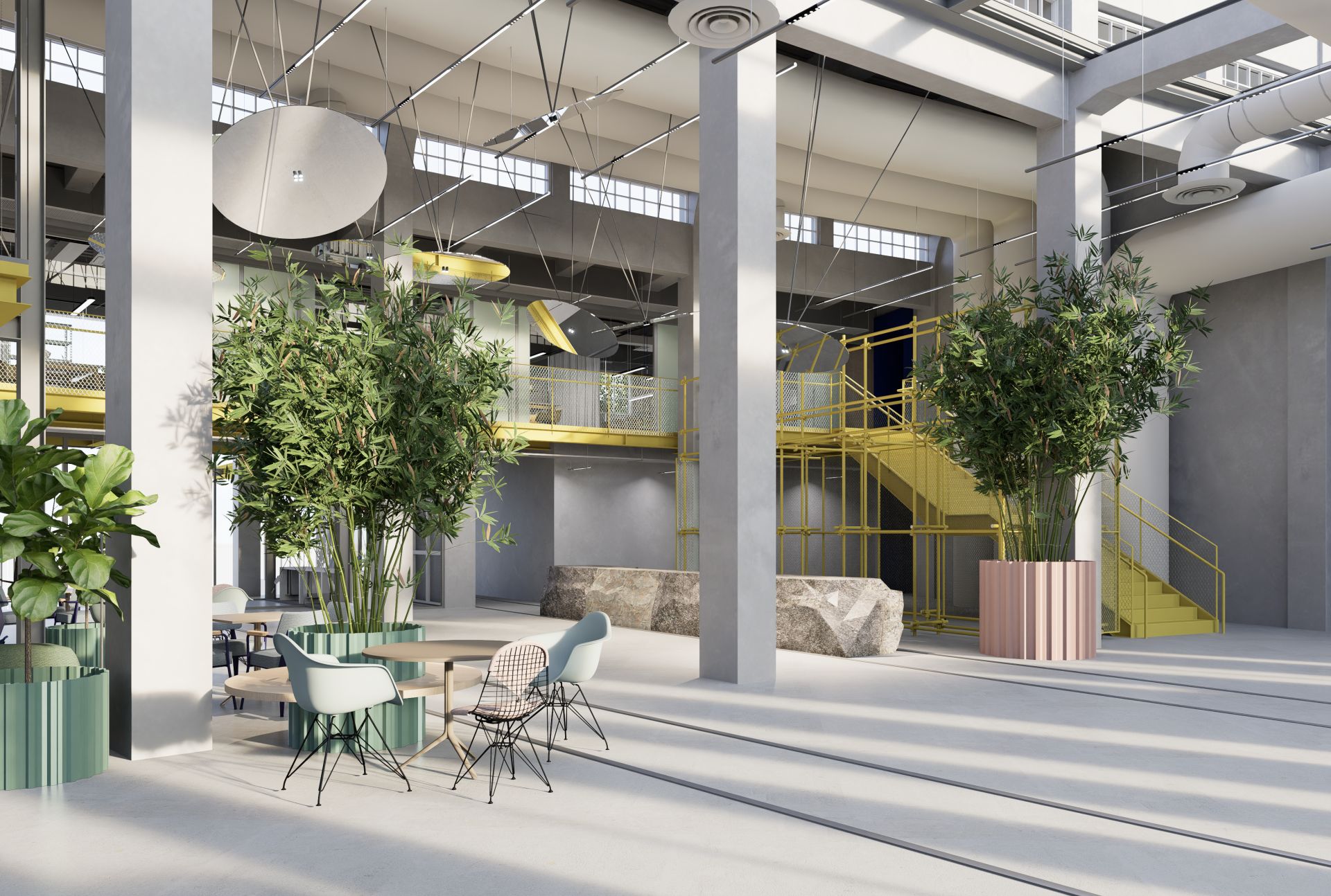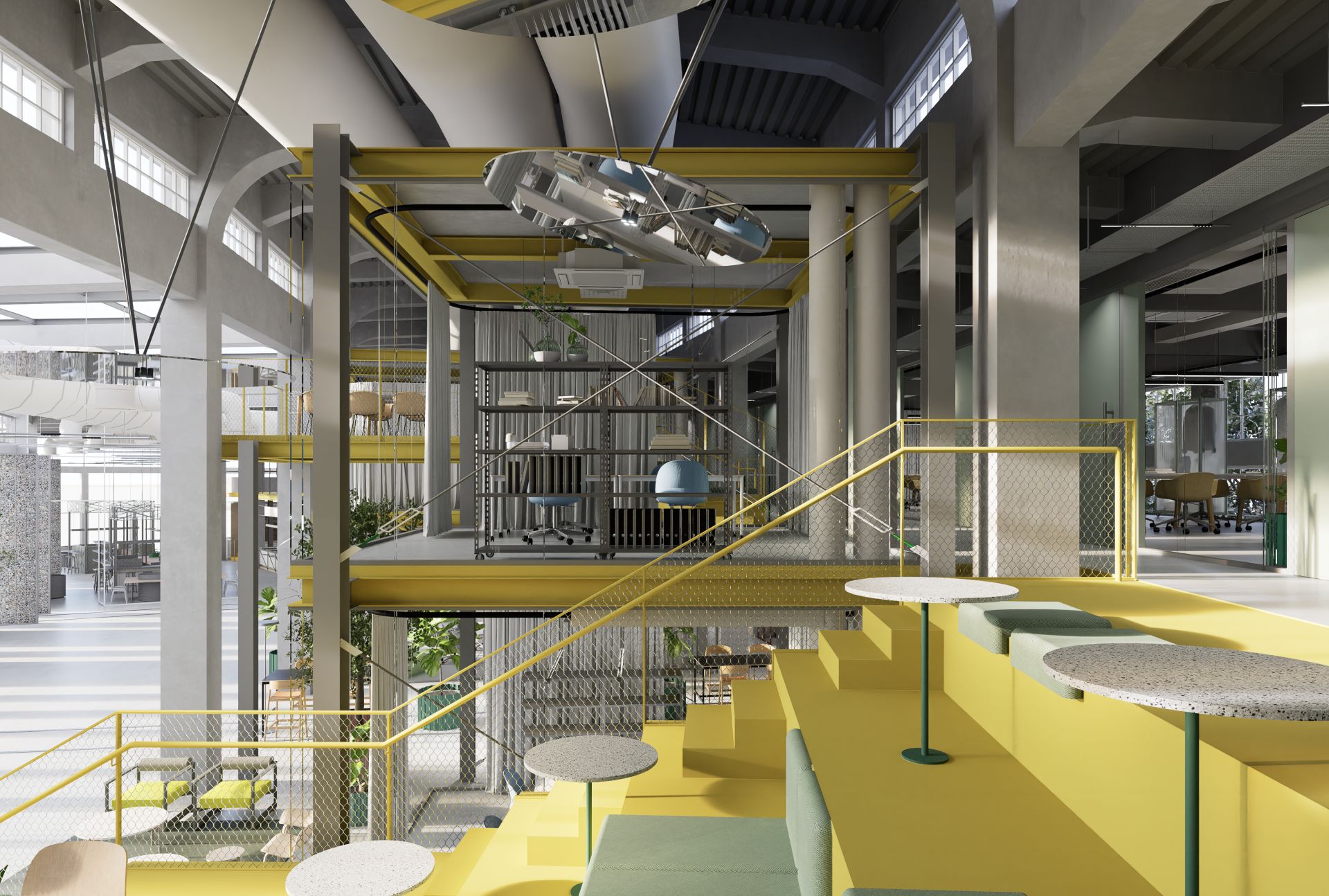 Međusobno su vizuelno povezane, tako da sve zajedno čine veliki otvoreni radni pejzaž novog haba, i dramatično naglašavaju moćni ritam originalnih armirano-betonskih ramova Ložionice.