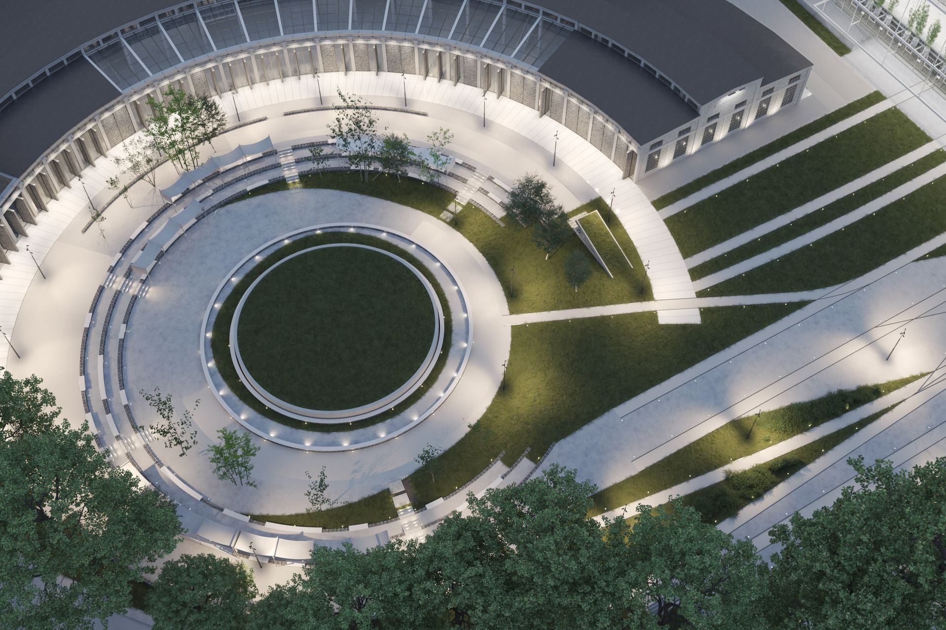 Okretnica, u skladu sa svojom originalnom namenom centralne tačke železničkog mehanizma, sada postaje žiža pešačkih tokova otvorenog javnog prostora novog kompleksa. Teren oko nje je blago upušten na dole, tako da formira neformalni amfiteatar sa letnjom scenom pod otvorenim nebom, i sa izloženom originalnom betonskom strukturom Okretnice u samom centru.