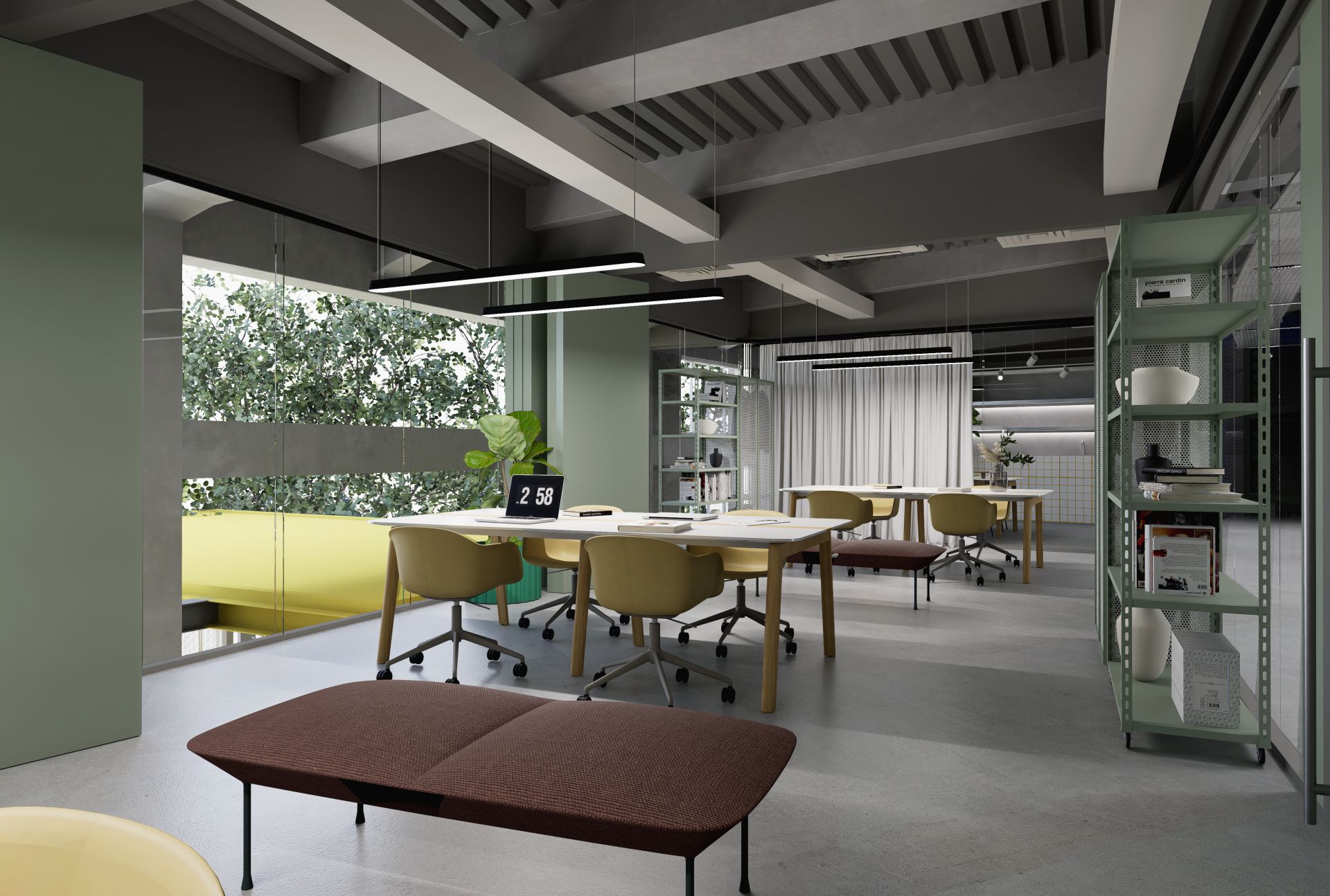 Na severnoj strani galerije projektovane su konvencionalne kancelarije, ali i radionice i sale za sastanke, dok na južnoj strani galerije dominira koncept savremenog haba gde se tribine i izdignute galerije sa otvorenim co-working prostorima, naizmenično prepliću sa zastakljenim prostorima kreativnih inkubatora i sala za sastanke profesionalnih udruženja.