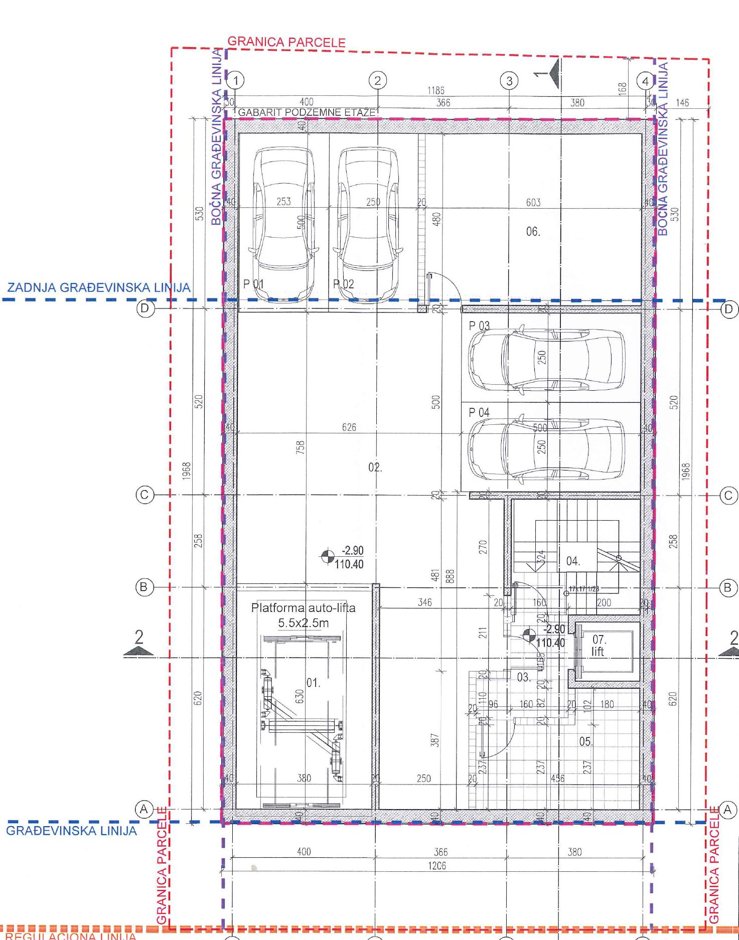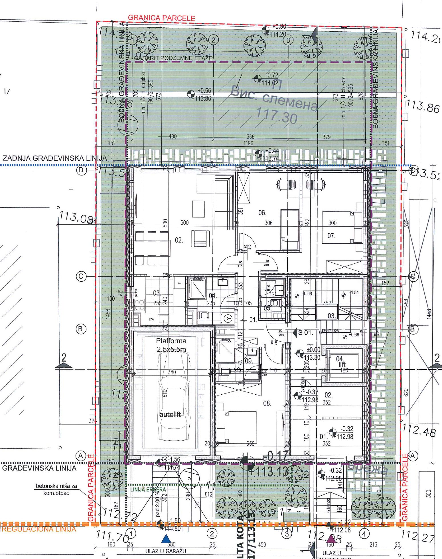 Pristup sa ulice garaži je omogućen preko kratke rampe do auto-lifta, a osim stepenišnog jezgra sa prostorom za nadpritisak u podrumskoj etaži predviđene su i površine za smeštaj tehničkih prostorija.