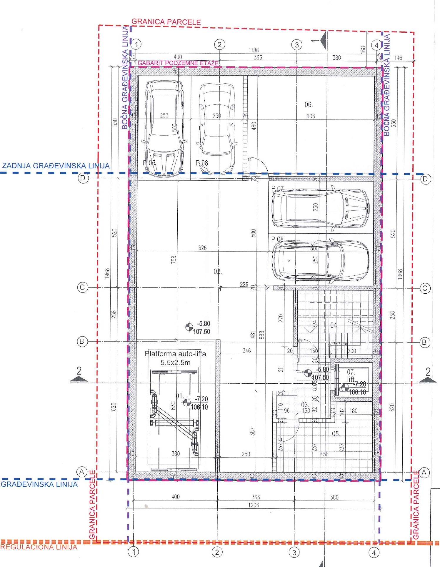 U okviru parking kapaciteta predviđeno je smeštanje ukupno 8 automobila, i to 4 na jednom i 4 na drugom nivou podrumske etaže.