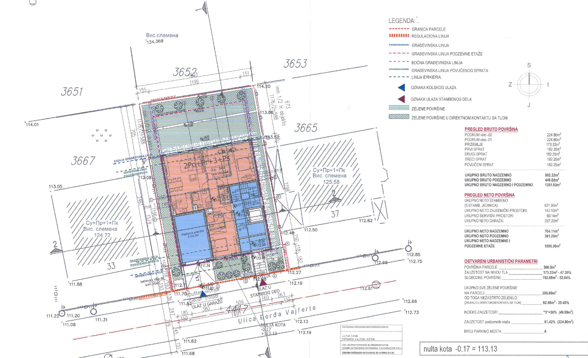 Na parceli je planirana izgradnja stambenog objekta spratnosti 2Po+Pr+3+Ps sa 5 stanova, ukupne BRGP od 1.351 kvadratnog metra – 902 m2 nadzemnih etaža i 449 m2 garažnih i tehničkih prostora u dve podzemne etaže.