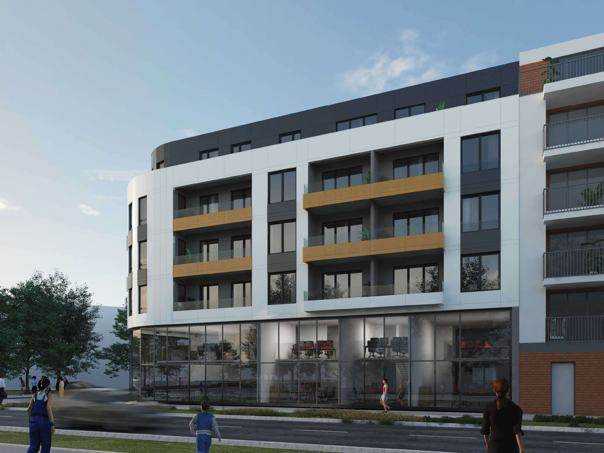 Poslovni deo u prizemlju objekta sadrži šest poslovnih prostora sa pripadajućim galerijama. Ulazi u poslovne prostore su iz Ulice Ljubice Bobić i Ulice Raška Dimitrijevića.