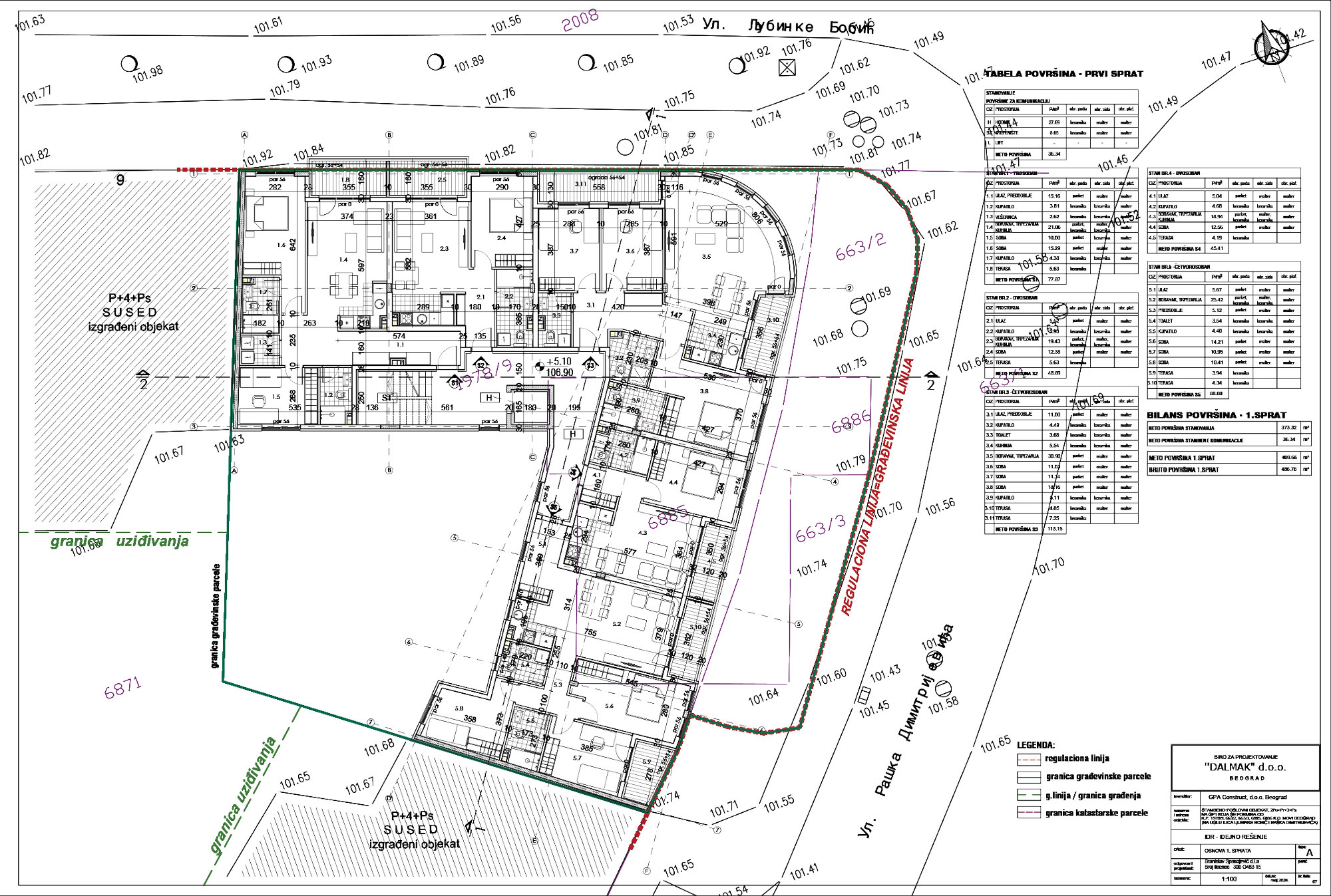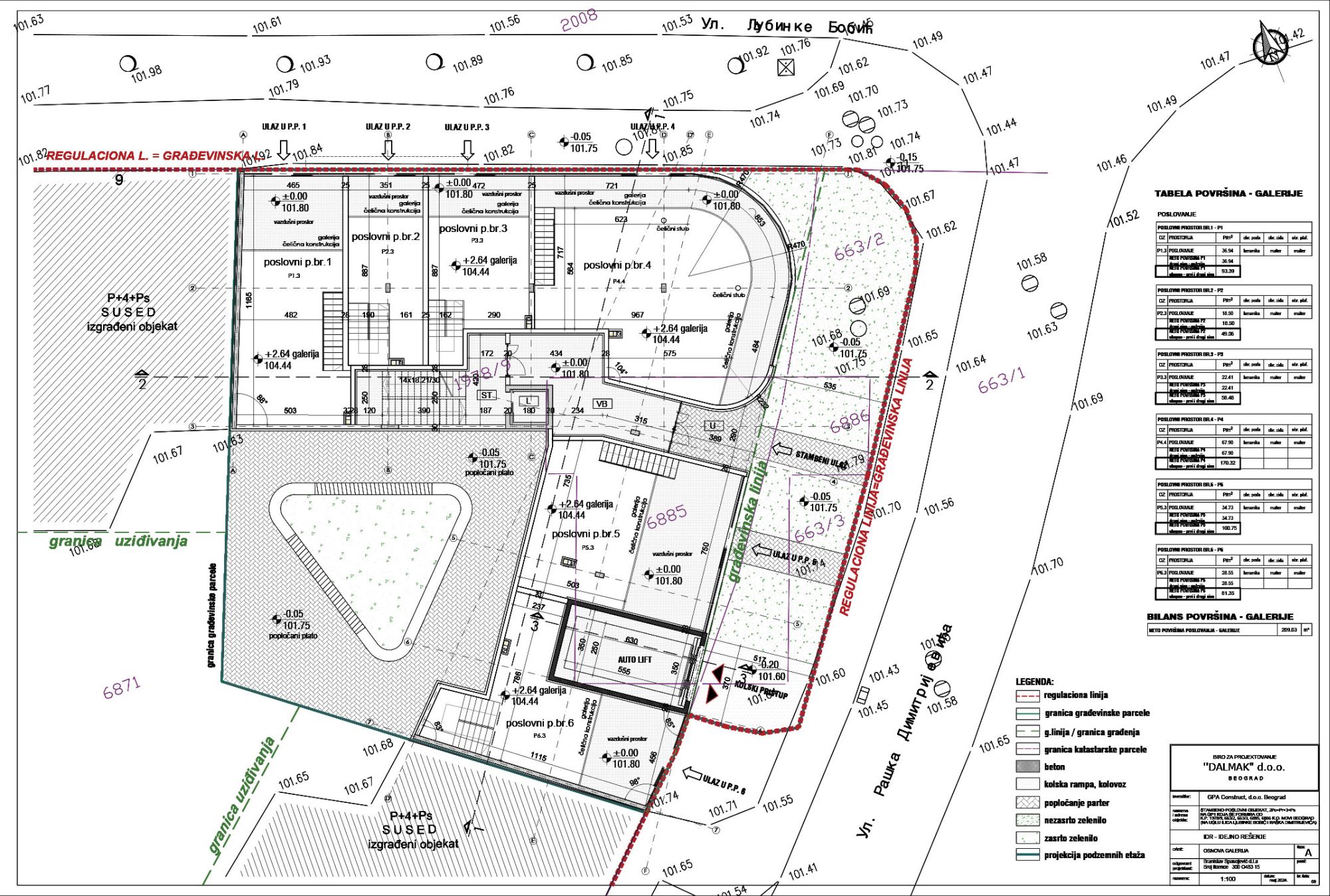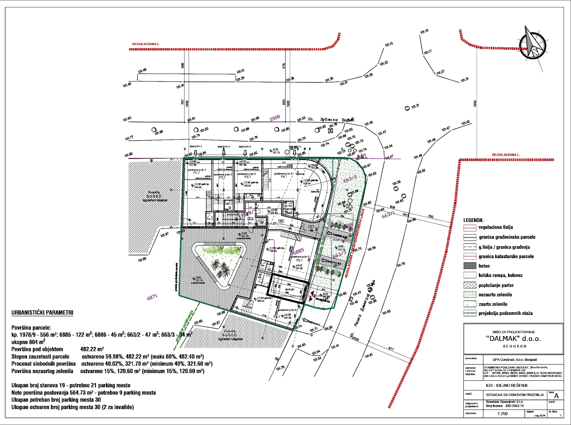 Na parceli se projektuje stambeno-poslovni objekat spratnosti 2Po+Pr+3+Ps, uzidan sa dve strane, na zapadnoj i južnoj strani parcele.