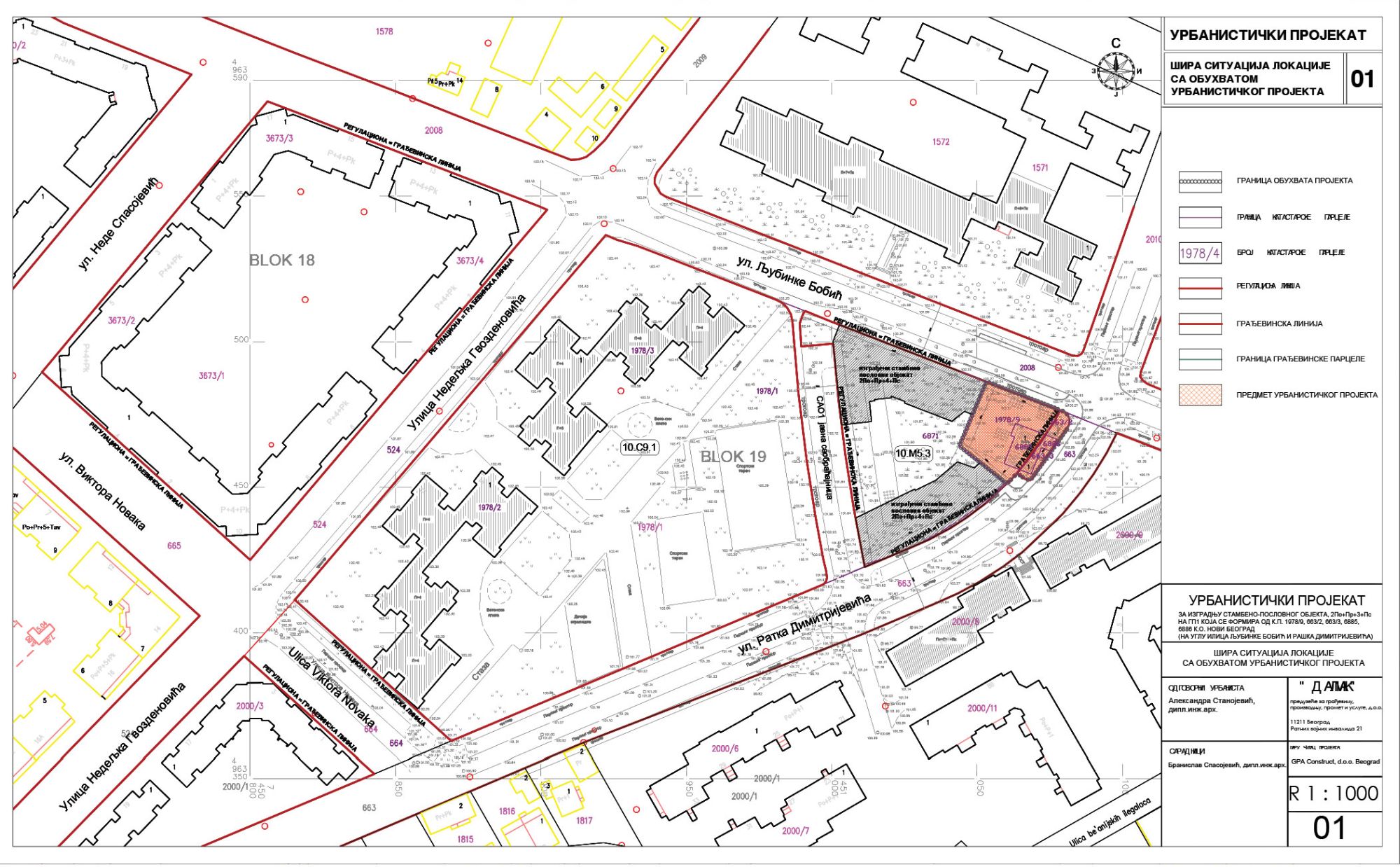 Izrada predmetnog urbanističkog projekta poverena je preduzeću Dalmak d.o.o. iz Beograda, na čelu sa Branislavom Spasojevićem, dia, dok je investitor GPA Construct d.o.o, malo beogradsko preduzeće iza kog stoji više stambenih zgrada na teritoriji opštine Zemun.