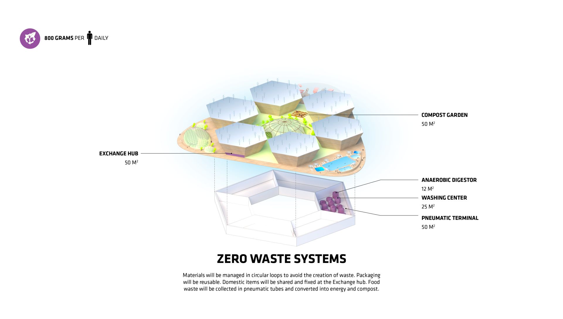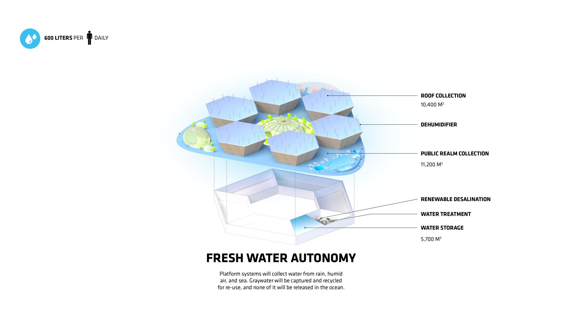 Osim što je otporan na poplave, grad će proizvoditi sopstvenu hranu, energiju i slatku vodu sa potpuno zatvorenim sistemom života bez otpada.