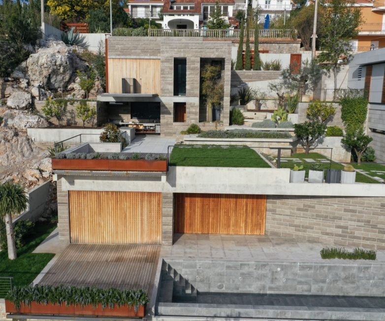 „Parterno rešenje parcele bilo je potrebno prilagoditi topografiji terena i opremiti stepeništima za nesmetano pešačko kretanje uz maksimalno formiranje zelenih površina sa izabranim rastinjem“, dodaju autori.