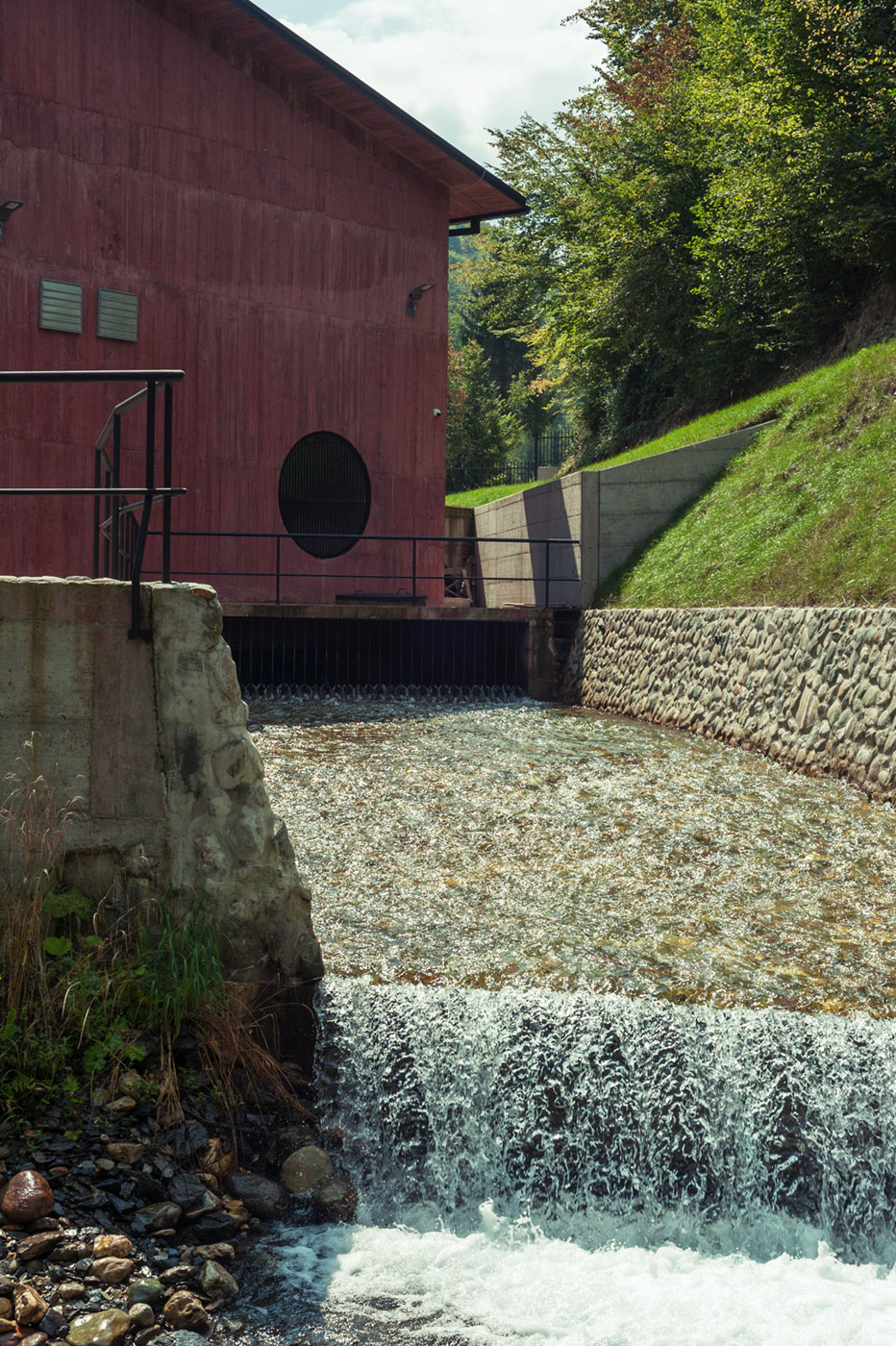 Osnovni uslov pri projektovanju mašinskih zgrada je da se instalirana oprema hidroelektrane obezbedi od pristupa nestručnih lica. „Naš cilj je bio da objekat približimo ljudima i otvorimo ga za posetioce.“ – kažu arhitekte. Tako su formirani različiti kadrovi na unutrašnjost. Kružni otvori, staklene i rešetkaste ispune u vratima omogućavaju da se sva oprema vidi, a ujedno obezbeđuju propisanu distancu. Mašinska zgrada tako nije zona zabranjenog pristupa.