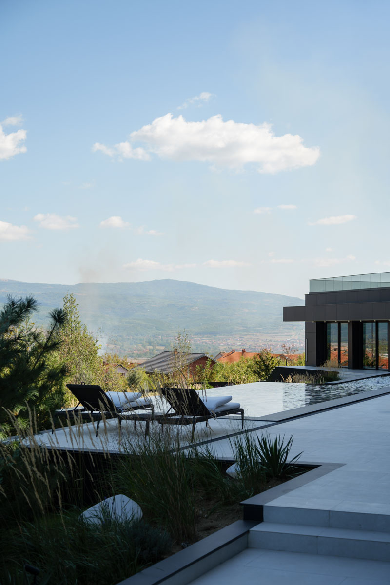 Napominju da objekat deluje kao da potpuno mirno i prirodno leži na zelenoj padini, dok je dominantni motiv pejzažnog uređenja precizno isečena „infinity“ linija vode bazena na slici grada u daljini.