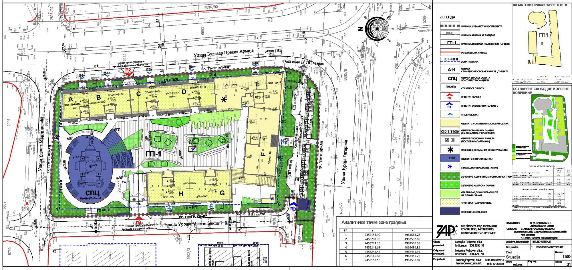 S tim u vezi, urbanističko rešenje definisano je na način da se u najvećoj mogućoj meri oslobodi unutrašnji prostor bloka organizovanjem stambenih i poslovnih lamela po obodu kompleksa uz regulacije ulica Uroša Martinovića 1, Jurija Gagarina i Bulevar Crvene armije.