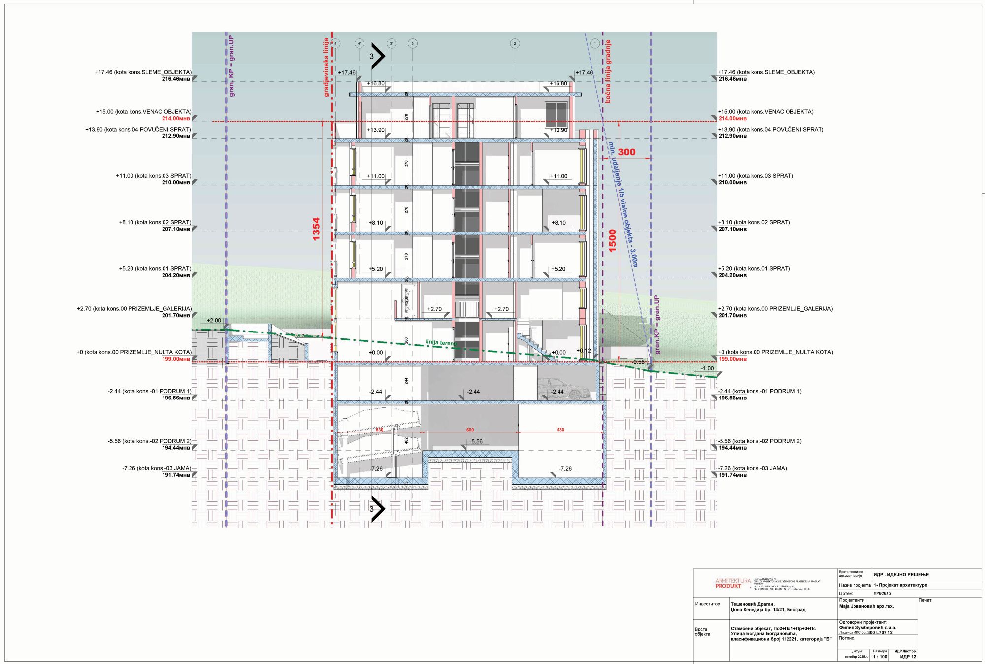 Novoprojektovani objekat je po tipu izgradnje slobodnostojeći objekat, po nameni stambeni, spratnosti Po2+Po1+P+3+PS. Ostvarena BRGP podzemnih etaža iznosi 524 m², nadzemnih 974 m², čime dolazimo do ukupne BGRP objekta od 1.498 m². Ukupna neto (korisna) površina objekta iznosi 1.452 m².
