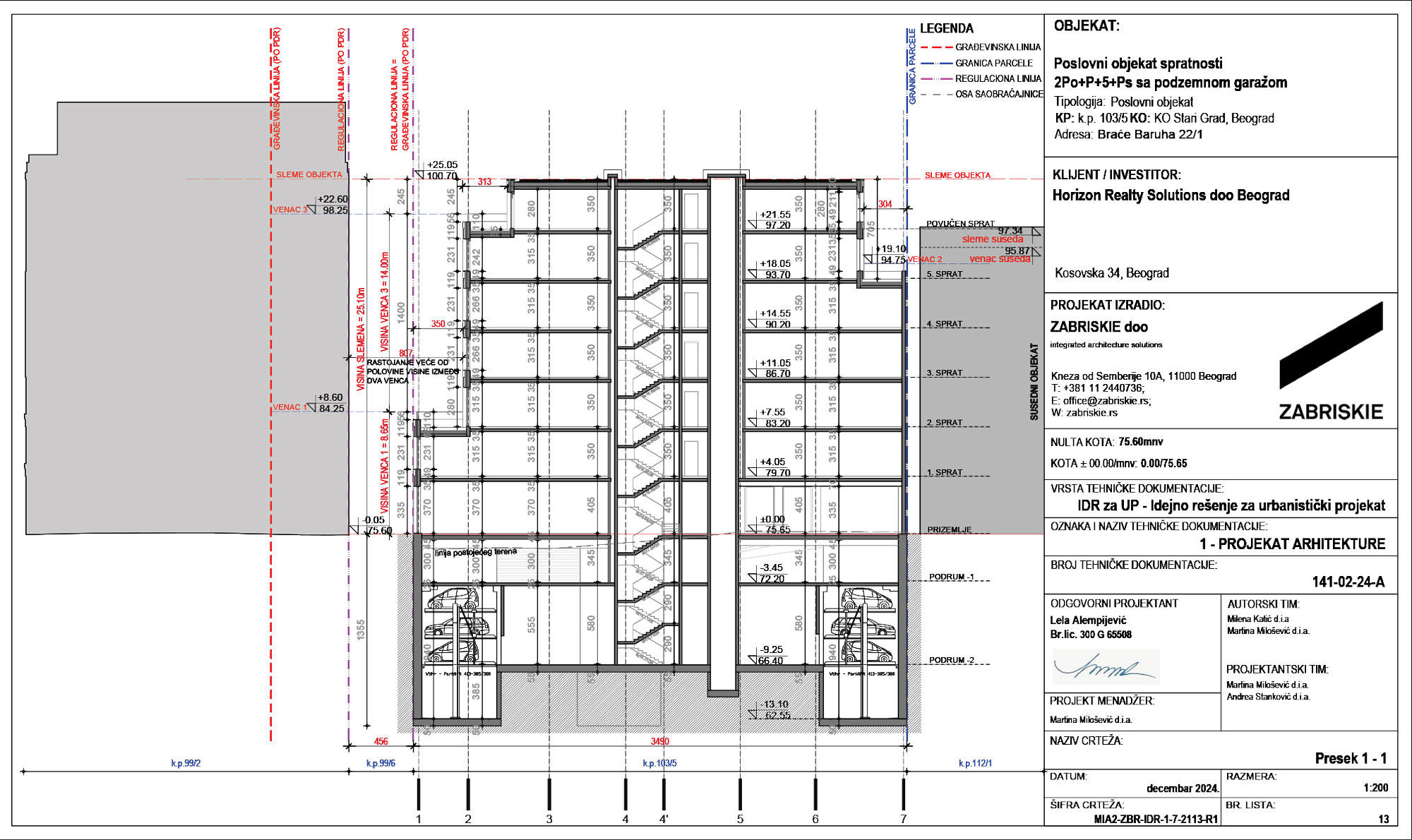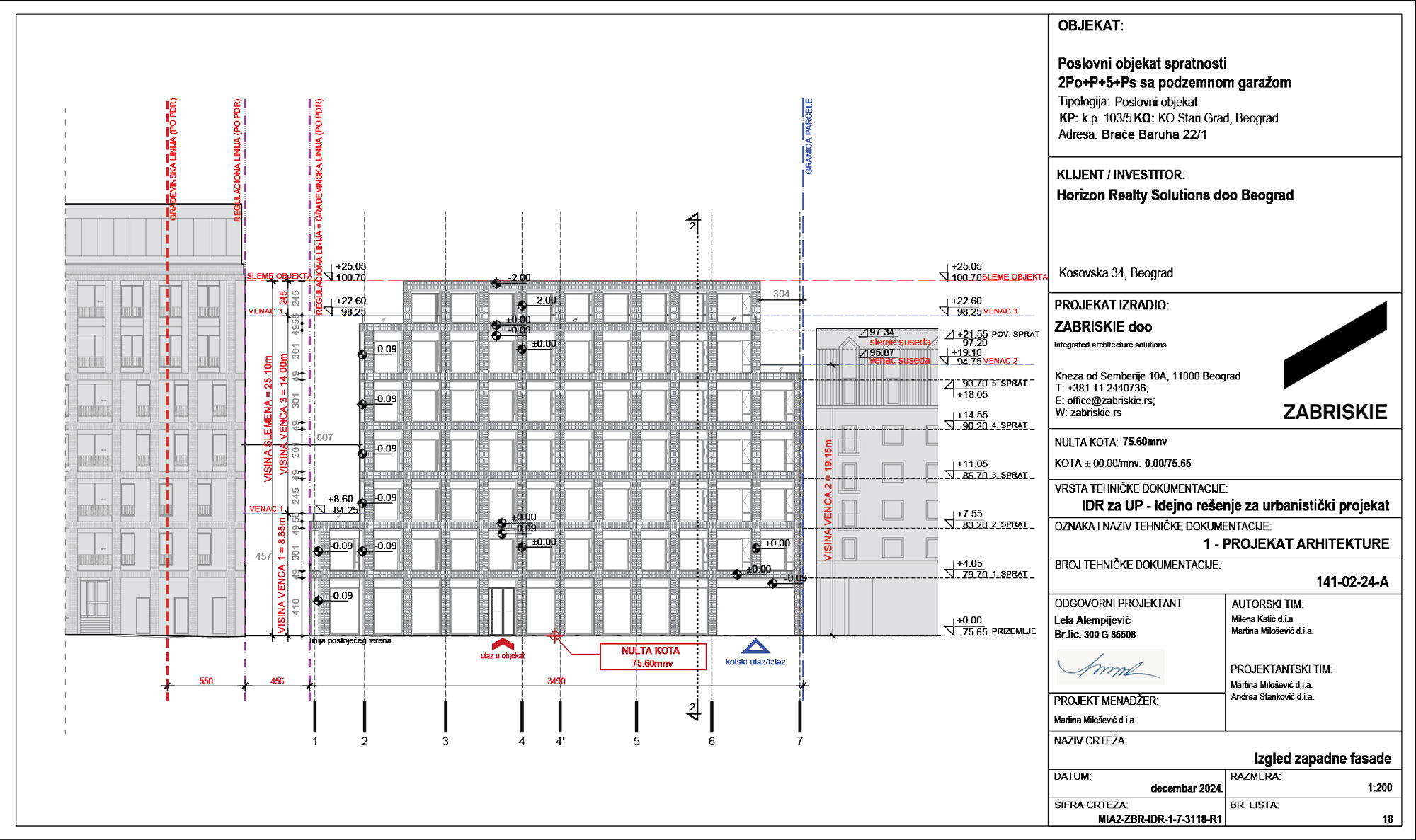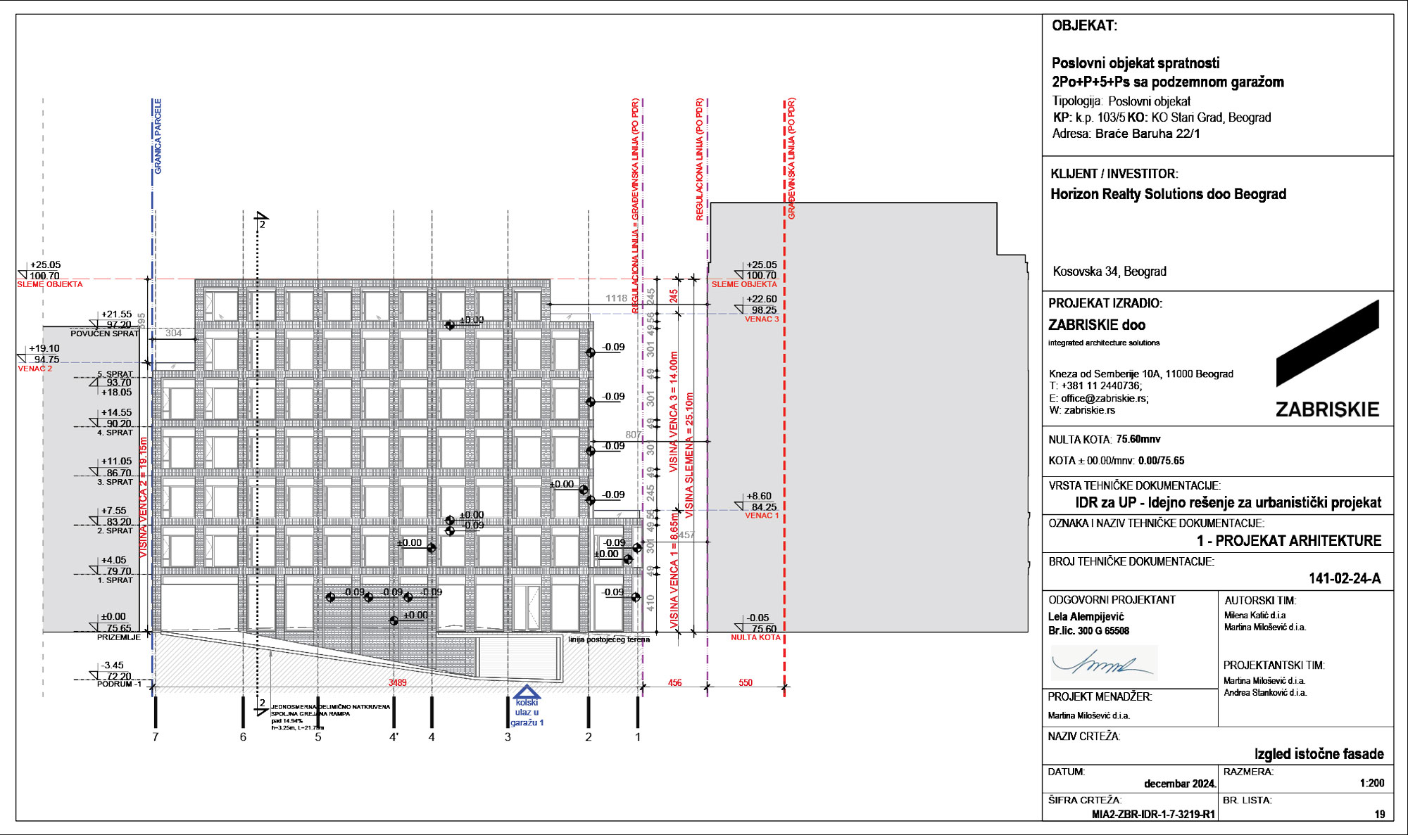 Projektnom dokumentacijom predviđa se izgradnja novog poslovnog objekta, nadzemne spratnosti P+5+Ps, sa dve podzemne garaže na dva nivoa.