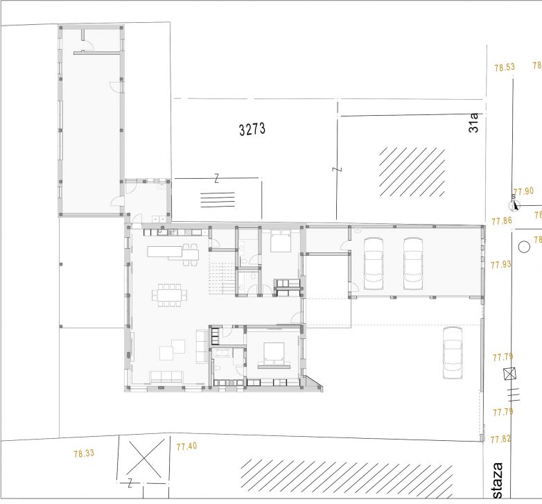 Veličina parcele je nametnula povlačenje stambenog dela objekta sa regulacije, ali je zadržana fasadna ravan objekta postavljanjem garaža i ulične ograde na regulaciju ulice, čime se ne stiče utisak da je postojeći niz prekinut.