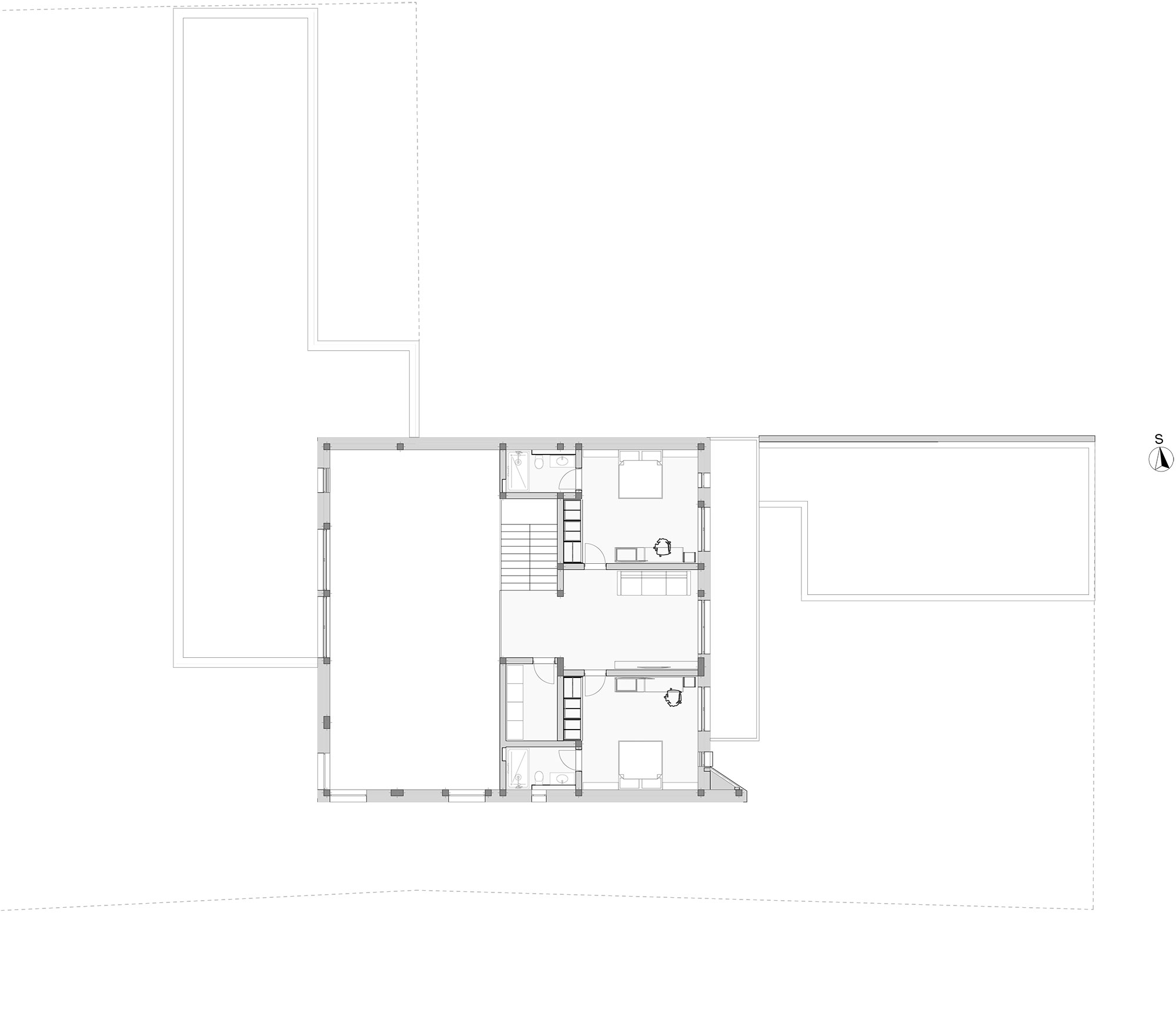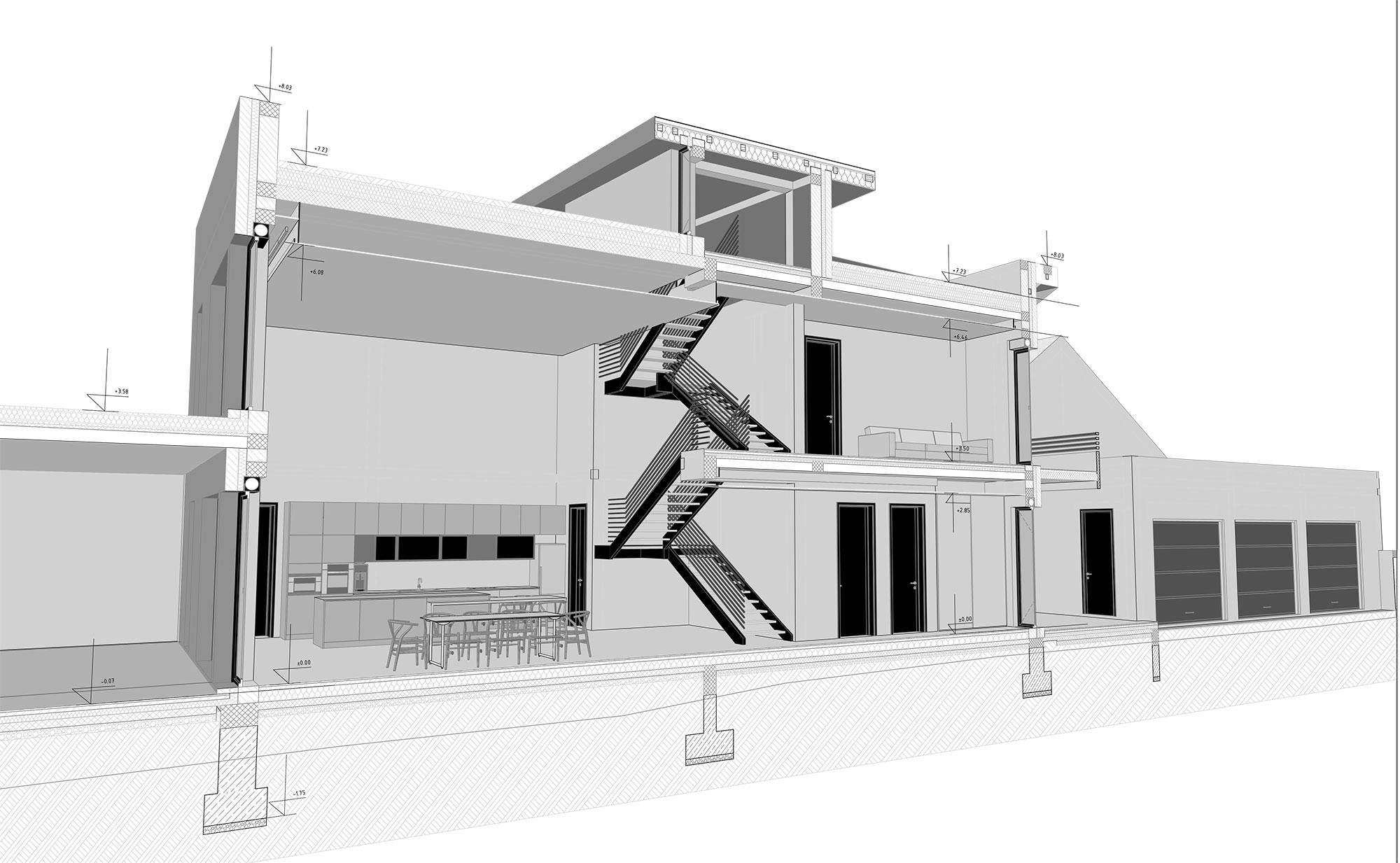 Iako su funkcionalni sadržaji jasno odvojeni i nezavisni, sve je povezano sa centralnim dnevnim boravkom koji se proteže kroz dve spratne visine i čini “srce” objekta, ognjište koje okuplja celu porodicu.