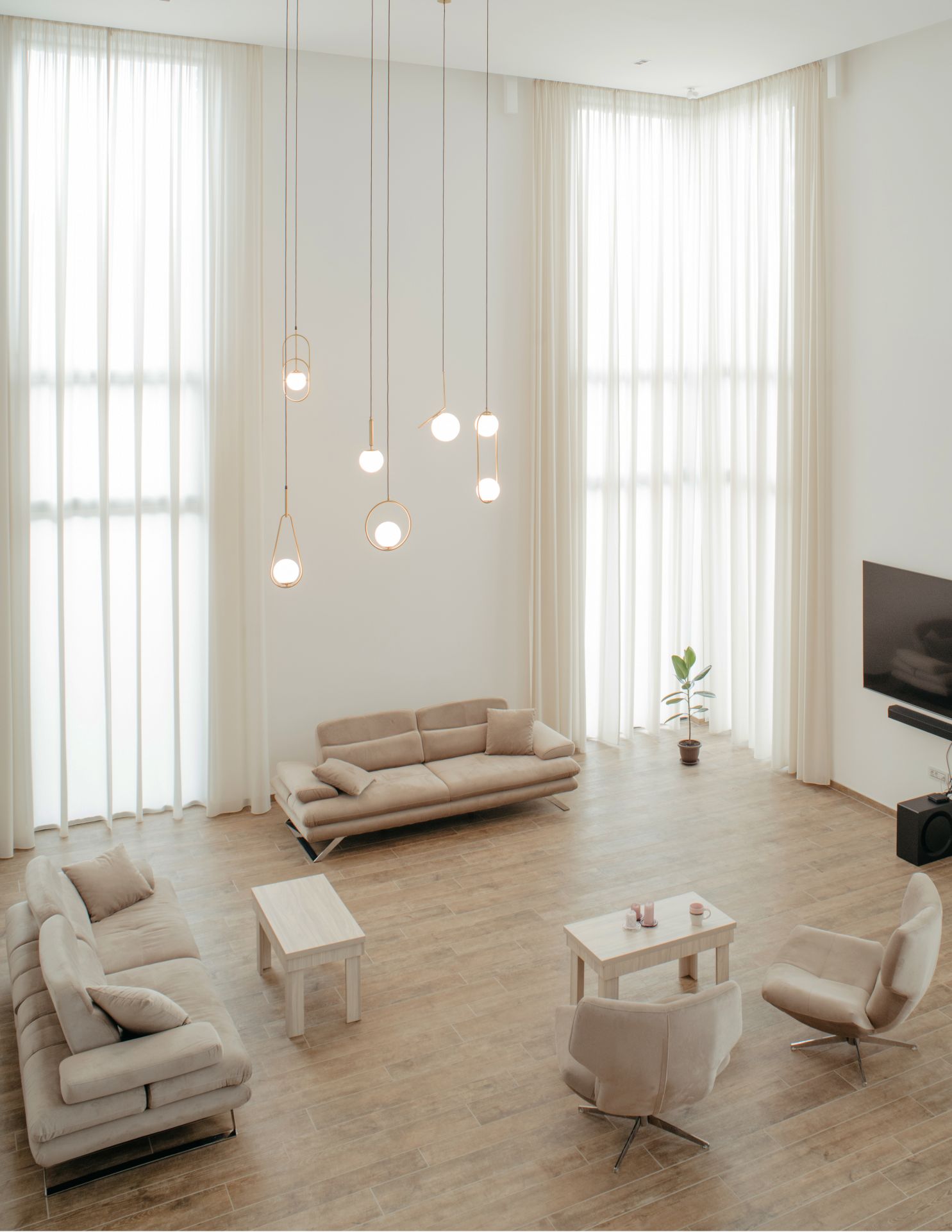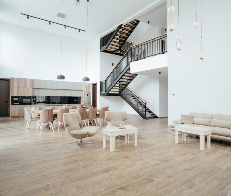 Dnevni boravak se proteže kroz dve spratne visine i čini “srce” objekta, ognjište koje okuplja celu porodicu.