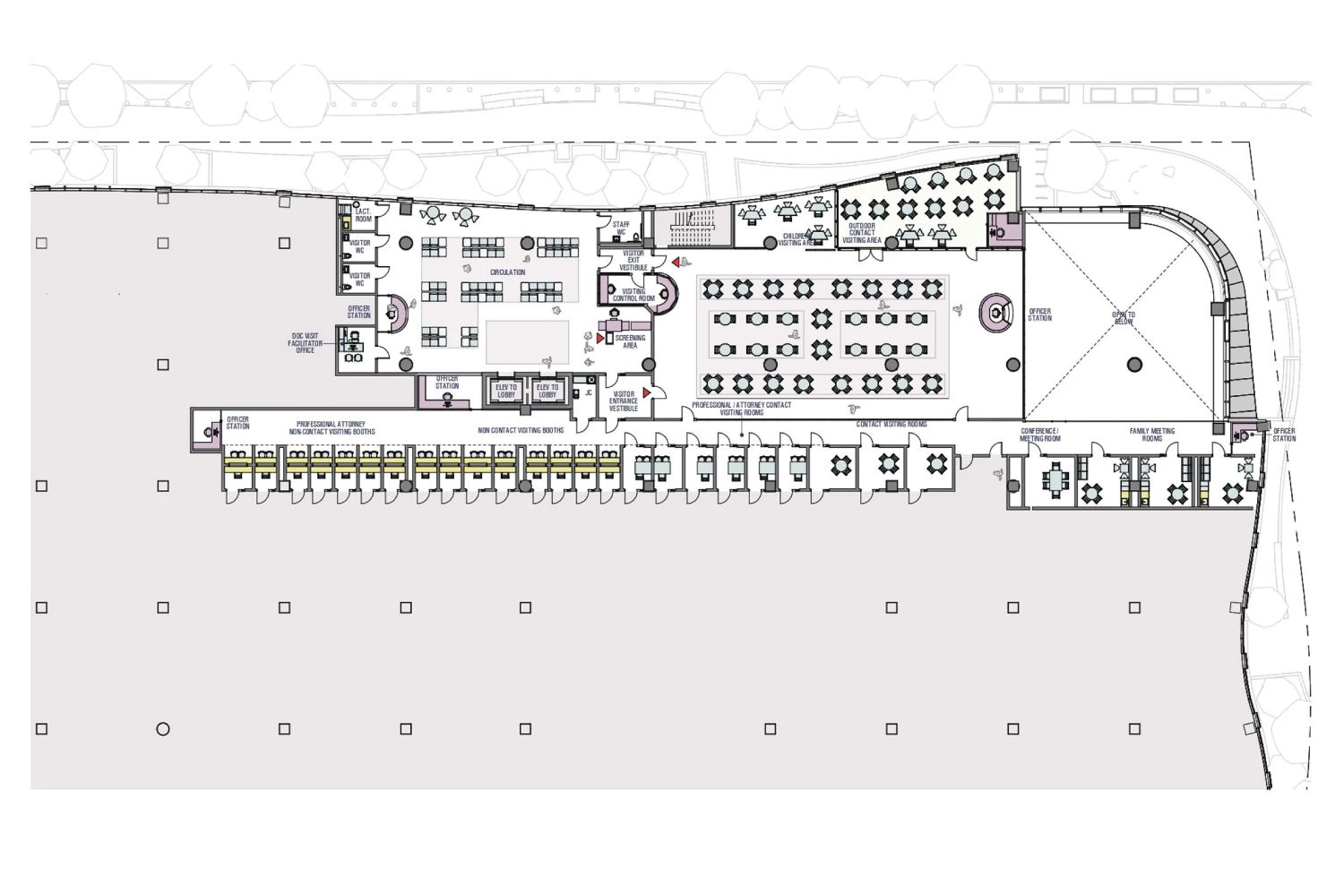 Rekreativni prostori su smešteni na krajnjim tačkama lokacije i formiraju prostore ograđene mrežom koji se protežu uz krila zgrade. Arhitekte ističu da su javni pristupni prostori ključni za cilj stvaranja humanijeg, „komšijskog“ objekta, za razliku od izolovanog zatvora na Ostrvu Rajkers.