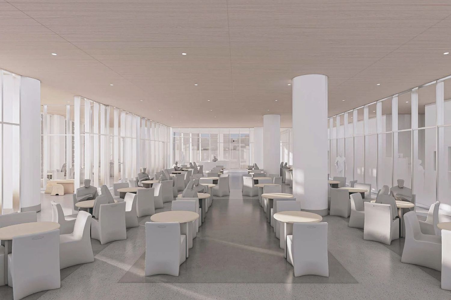 Na renderima enterijera mogu se videti zajedničke ćelije i rekreativni prostori raspoređeni oko centralnog hodnika. Zajednički prostori zauzimaju veći deo „krakova“ zgrade, dok su ćelije raspoređene oko njih. Takođe, mogu se videti i lobi zatvora sa rebrastim zidovima, svetlim drvetom i teraco podom.