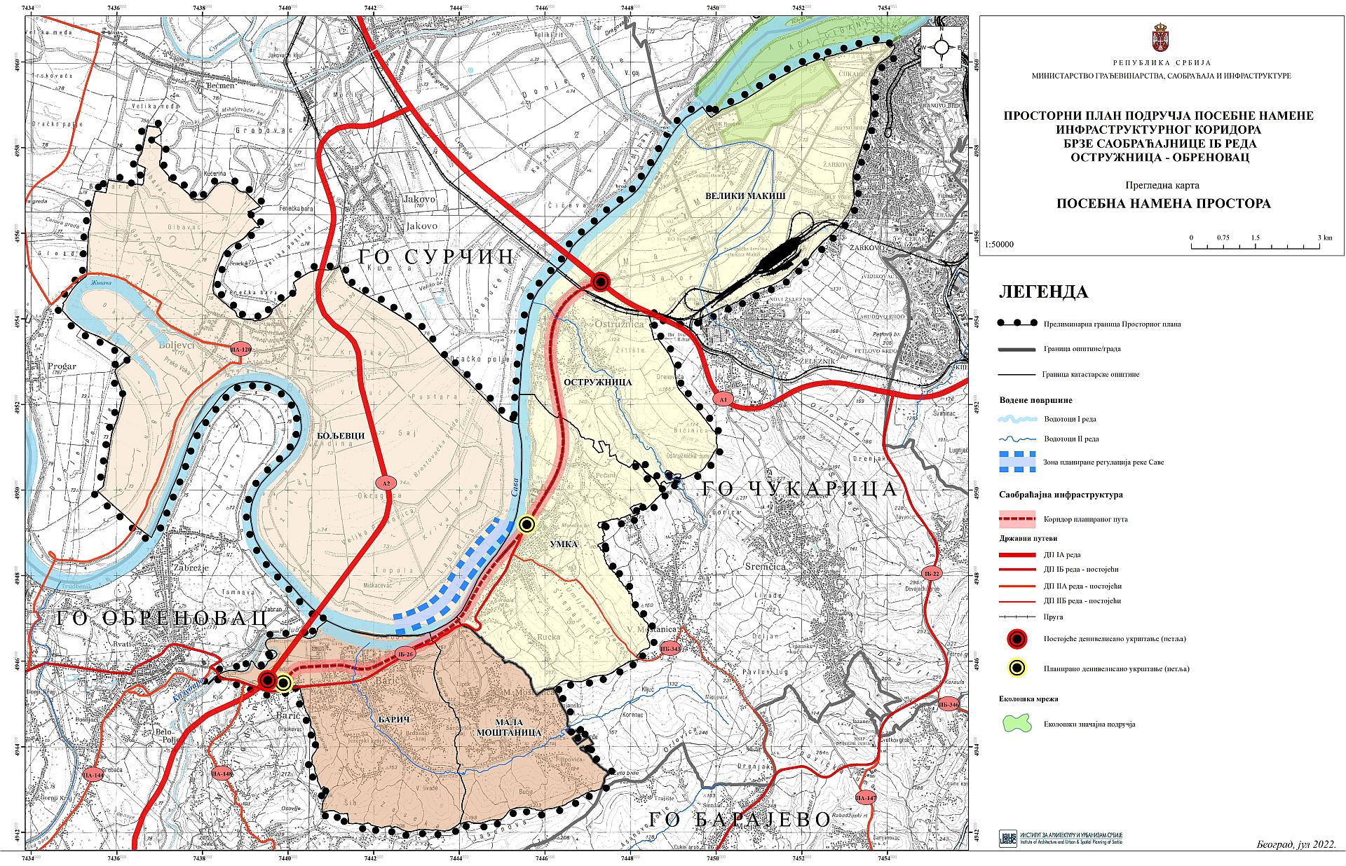- koridor planirane Brze saobraćajnice, na pravcu od Ostružnice do veze sa državnim putem IA reda E-763 (petlja „Obrenovac“), ukupne dužine oko 14,8 km i širine od 50 do 300 m, koji obuhvata trasu sa zaštitnim pojasevima Brze saobraćajnice;