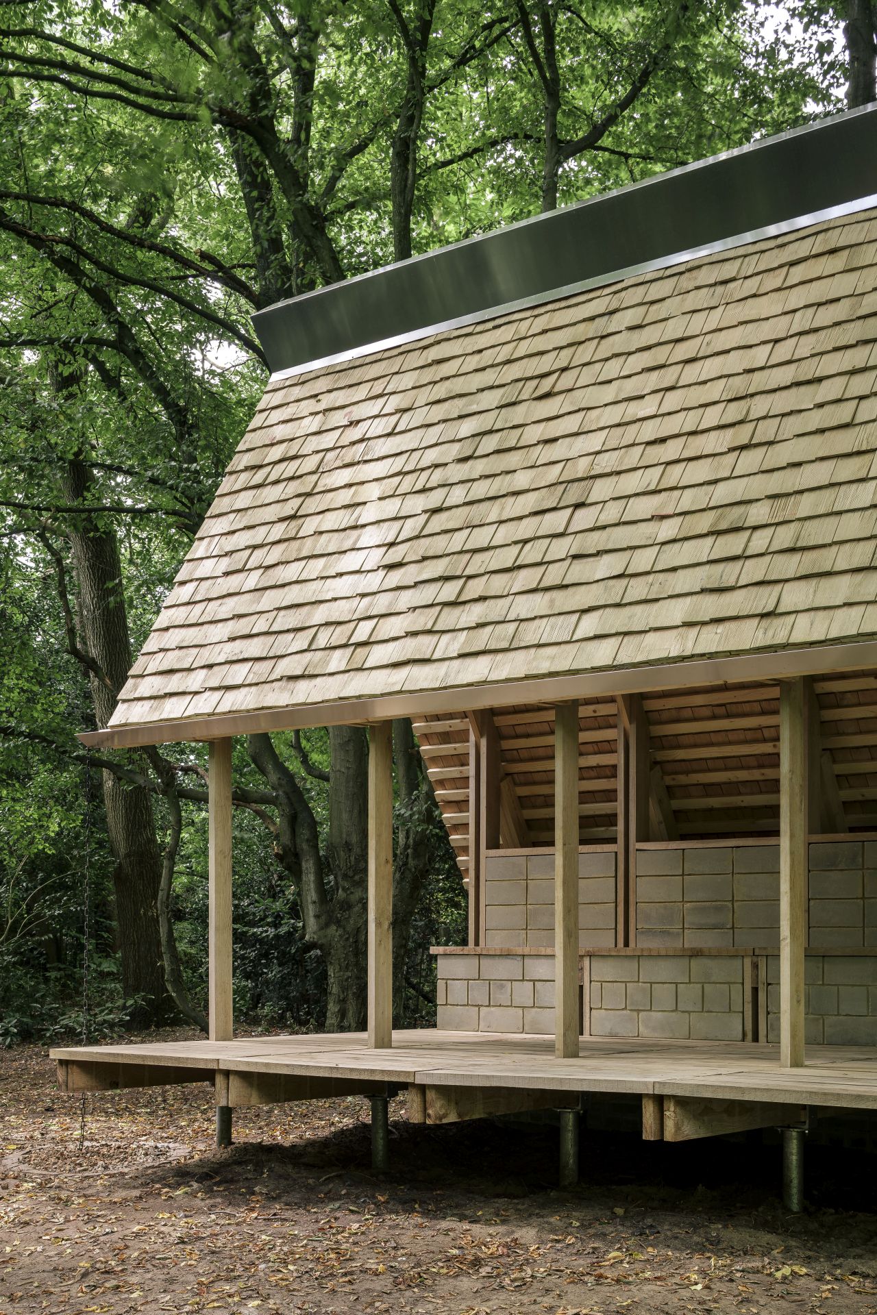 Jedan deo drvene konstrukcije paviljona sastavljen je od odbačenih odsečaka drveta koje je donirala lokalna građevinska kompanija. Preostali drveni elementi izrađeni su od hrastovih greda nabavljenih po niskoj ceni zbog nepravilnog oblika, pukotina i tragova buđi.